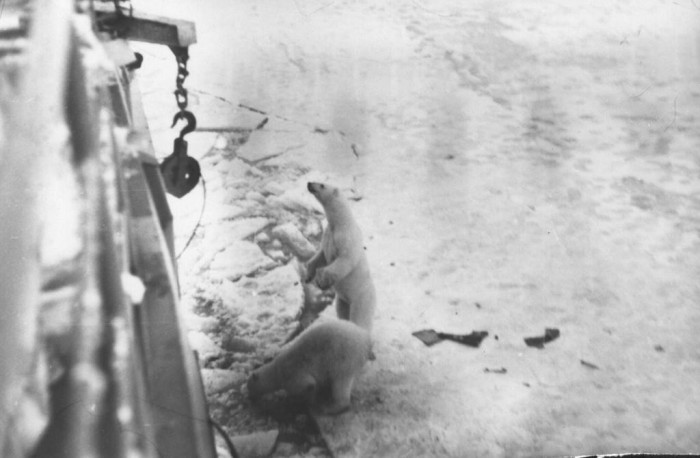 «Внимание! Внимание! Всем находящимся на льду! — вдруг разнеслось по судовой трансляции. — Со стороны кормы к ледоколу приближается белый медведь!» Опять непрошеный гость. Что-то они зачастили; в некоторые дни приходило до пяти медведей. На крайний случай в распоряжении работающих на льду имеется карабин, но пока до применения его дело не доходило.