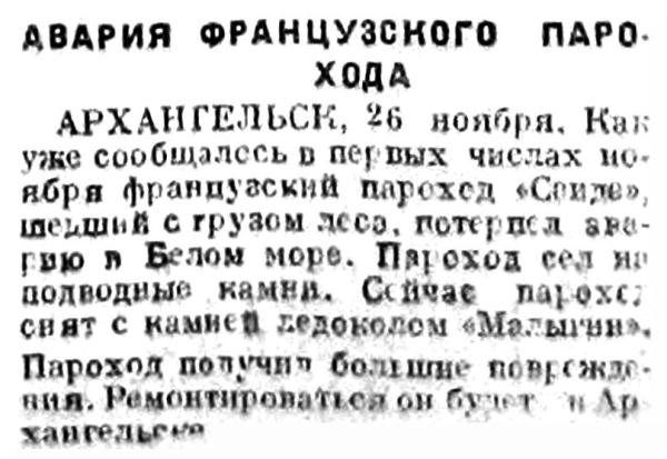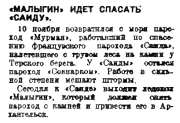 10 ноября возвратился с моря пароход "Мурман", работавший по спасению французского парохода "Саида", налетевшего с грузом леса на камни у Терского берега. У "Саиды" остался пароход "Совнарком". Работе в сильной степени мешают штормы.