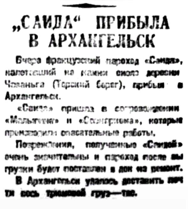Вчера французский пароход "Саида", налетевший на камни около деревни Чаваньга (Терский берег), прибыл в Архангельск.
