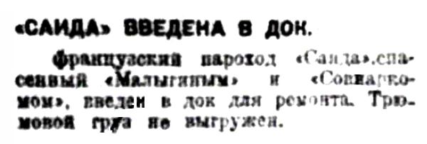 "САИДА", 20. (По радио от соб. корр). "Саида" сидит на рифе серединой. Произведенной отгрузкой для избежания перелома приподнята корма. Установлены для машин помпы для откачки воды из машинного отделения. Водолазами обследован правый борт, наиболее поврежденный. Ночью отгружался бункер. Работают пароходы "Кия" и "Совнарком". "Малыгин" стоит наготове с заведенным буксиром. Если не повторится вчерашний шторм, сильно ухудшивший положение, завтра попытаемся снять "Саиду".