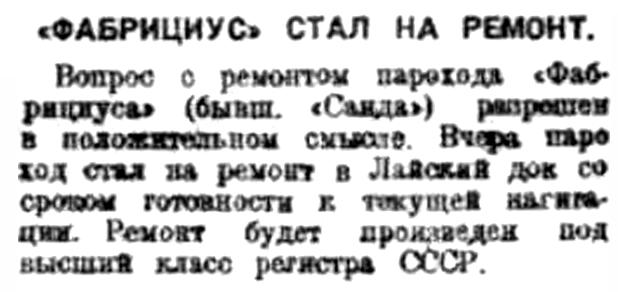 Вопрос с ремонтом парохода "Фабрициус" (бывш. "Саида") разрешен в положительном смысле. Вчера пароход стал на ремонт в Лайский док со сроком готовности к текущей навигации. Ремонт будет произведен под высший класс регистра СССР.