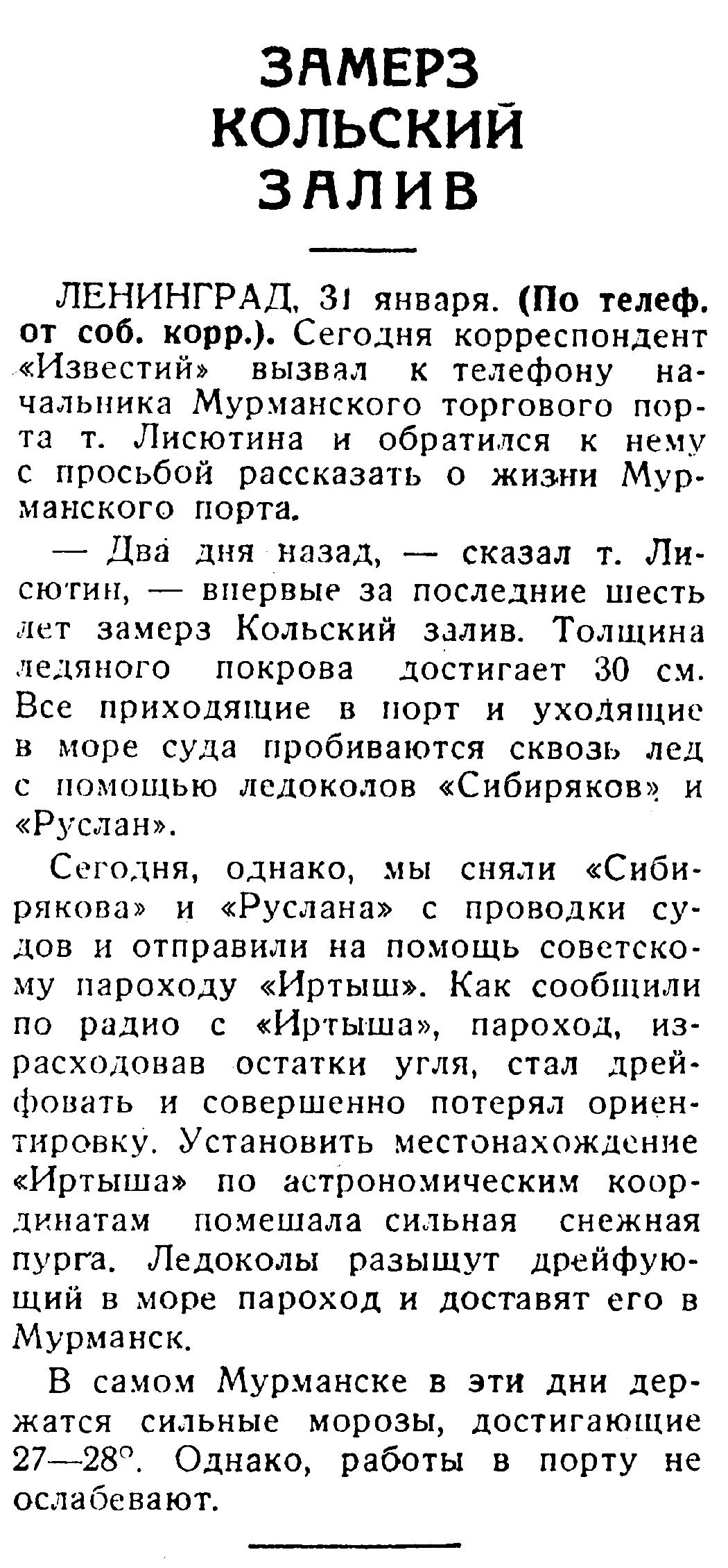 — Два дня назад, — сказал т. Лисютин, — впервые за последние шесть лет замерз Кольский залив. Толщина ледяного покрова достигает 30 см. Все приходящие в порт и уходящие в море суда пробиваются сквозь лед с помощью ледоколов «Сибиряков» и «Руслан».