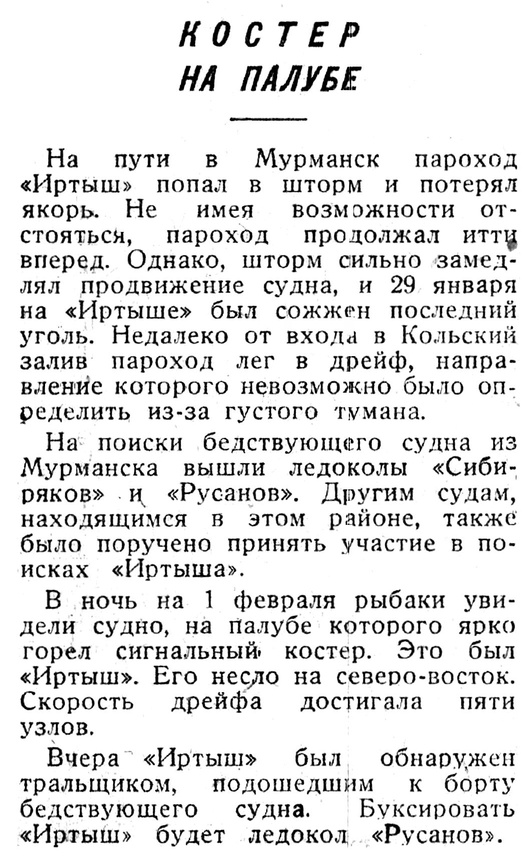 Сегодня, однако, мы сняли «Сибирякова» и «Руслана» с проводки судов и отправили на помощь советскому пароходу «Иртыш». Как сообщили по радио с «Иртыша», пароход, израсходовав остатки угля, стал дрейфовать и совершенно потерял ориентировку. Установить местонахождение «Иртыша» по астрономическим координатам помешала сильная снежная пурга. Ледоколы разыщут дрейфующий в море пароход и доставят его в Мурманск.