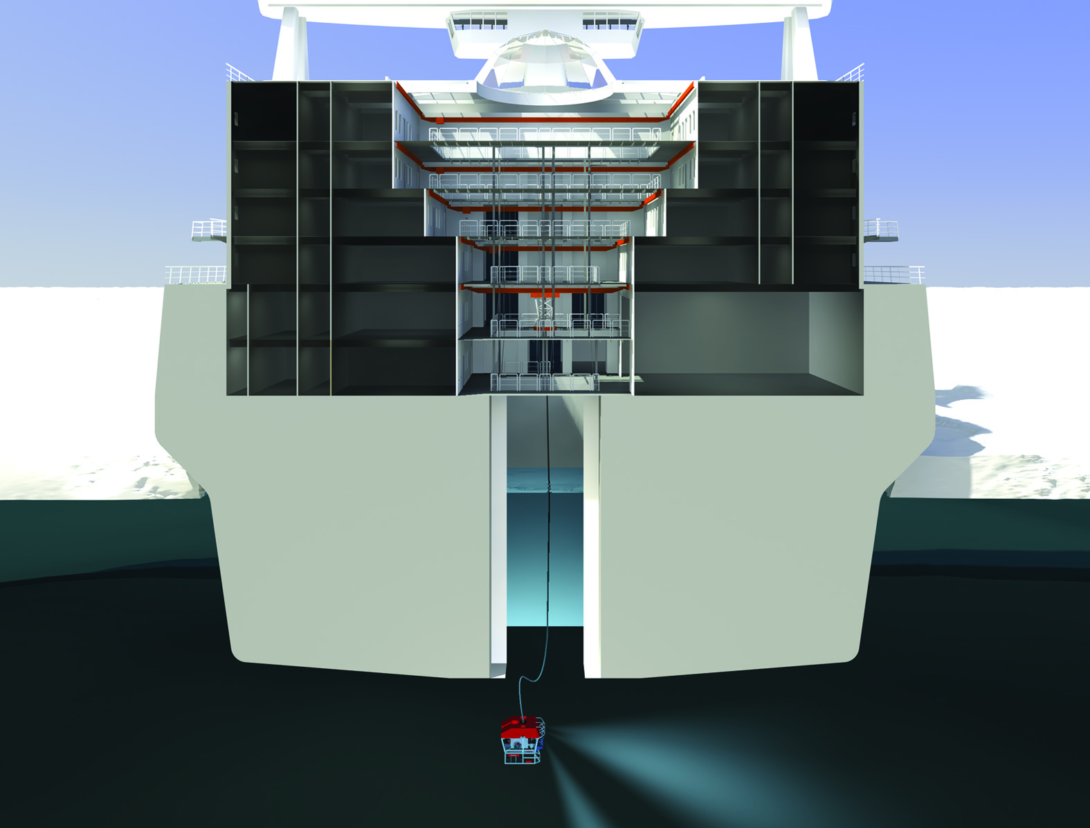 • Сквозные бассейны: 1 для научных буровых работ, 1 для другого научного оборудования, 7x7 м каждый.