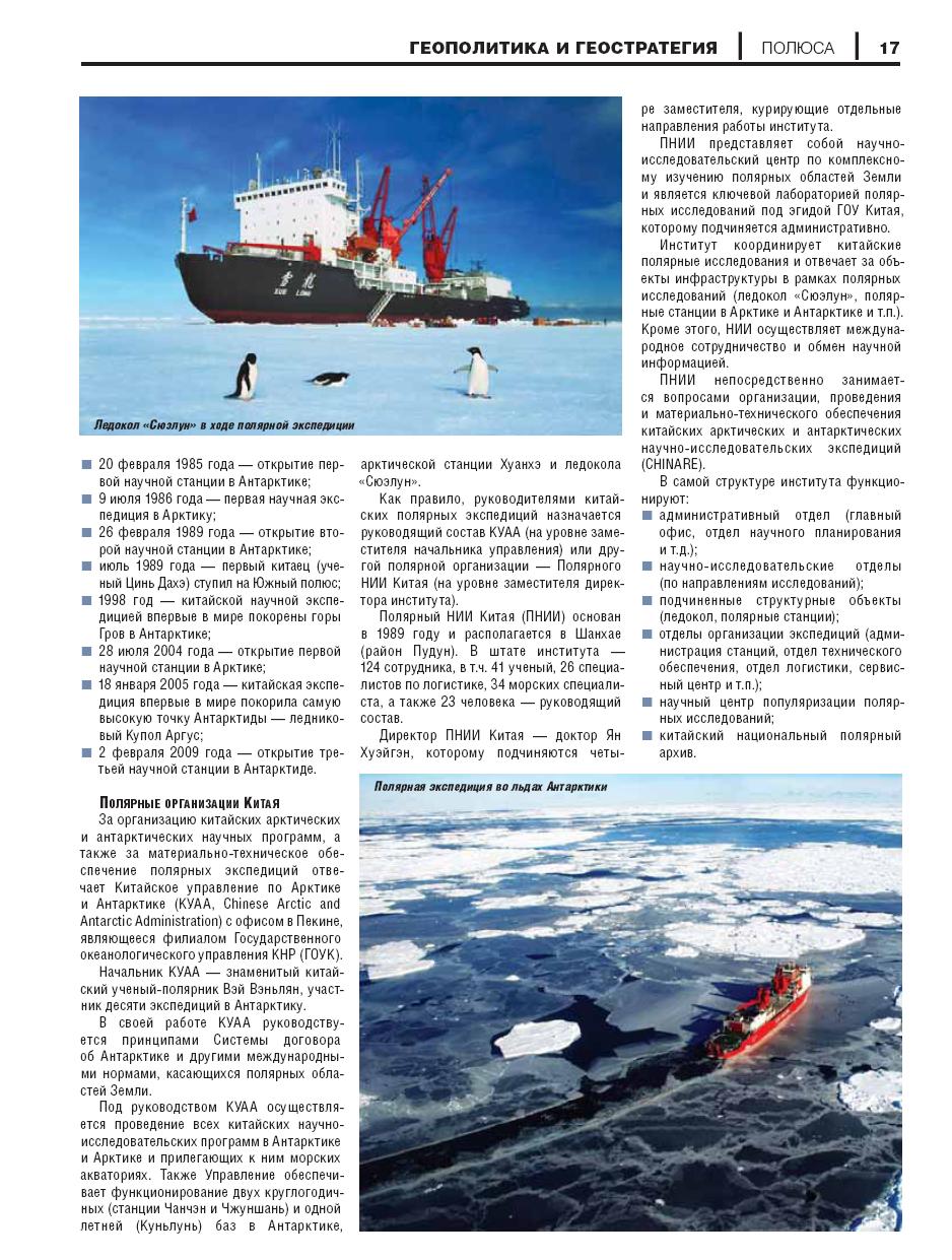 С 1984 года Китай ежегодно направля­ет свои полярные экспедиции к полюсам Земли и в прилегающие морские аквато­рии. Всего за 25 с небольшим лет Китай прошел путь, на который у других стран ушло более ста лет.