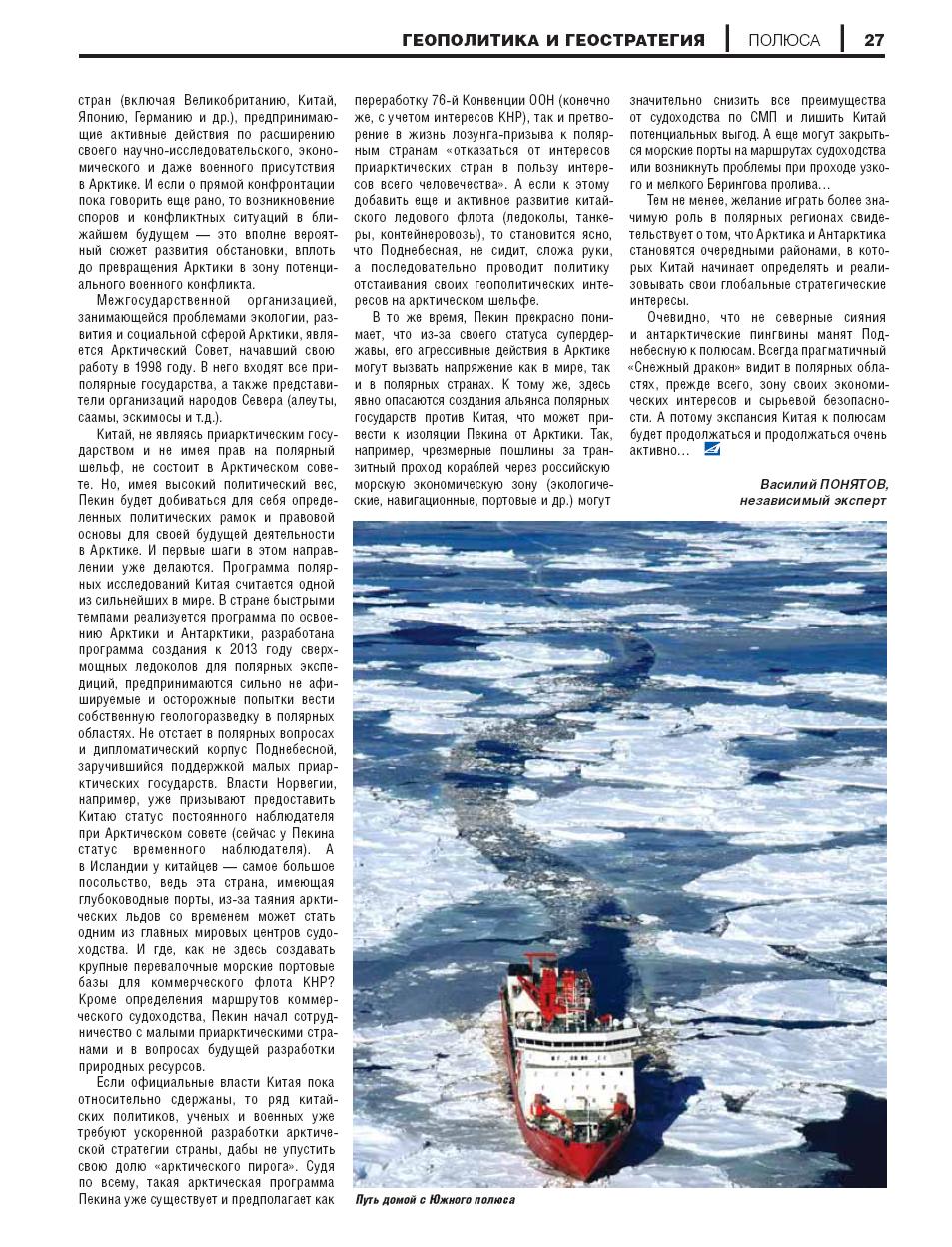 Геополитические амбиции Китая растут по мере того, как с каждым годом все мощнее н мощнее становится его экономика. Поднебесная активно осваивает российский Дальний Восток и Сибирь (конечно, разными способами), столбит своими инвестициями позиции в странах третьего мира, на Африканском континенте. Зоной китайских интересов уже объявлен Индийский океан, в котором уже второй год подряд уверенно демонстрируется китайский военно-морской вымпел — пять походов морских экспедиционных групп ВМС Китая в Аденский залив для защиты путей судоходства от пиратов — яркое тому подтверждение. А теперь Азиатский дракон серьезно нацелился на включение в зону своих жизненных интересов и полярных областей Земли — Арктики и Антарктики.
