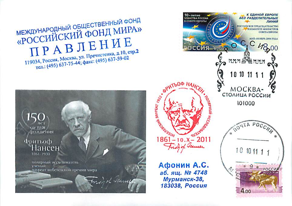 Россия 2011. 150 лет со дня рождения полярного исследователя, лауреата нобелевской премии Ф.Нансена