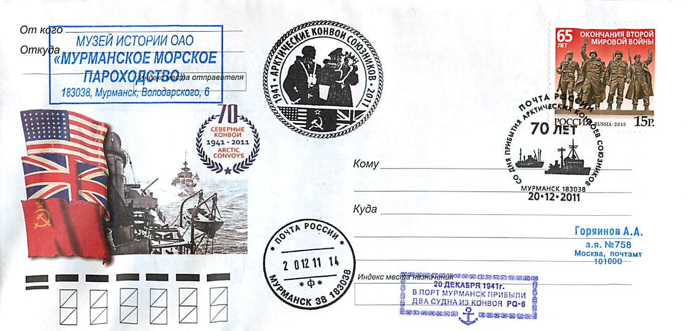 Россия 2011 70 ЛЕТ АРКТИЧЕСКИХ КОНВОЕВ СОЮЗНИКОВ. 20.12.1941 в порт Мурманск прибыли два судна из конвоя PQ-6 (Мурманск)