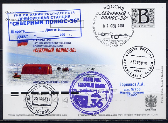 #1121 НАУЧНО-ИССЛЕДОВАТЕЛЬСКАЯ ДРЕЙФУЮЩАЯ СТАНЦИЯ "СЕВЕРНЫЙ ПОЛЮС-36" КАРТОЧКА С ЛИТЕРОЙ "В"