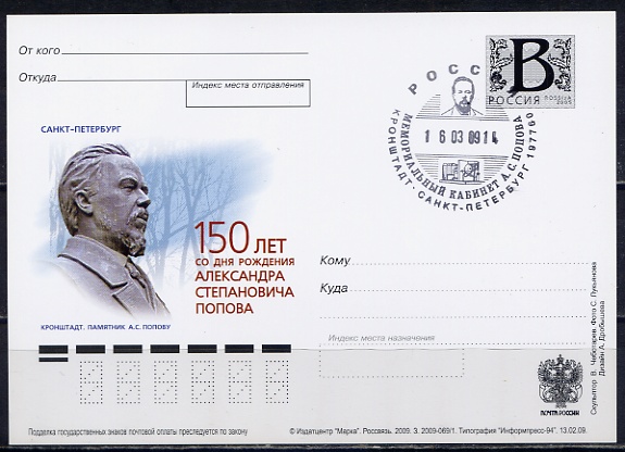 #1127 150 ЛЕТ СО ДНЯ РОЖДЕНИЯ А.С.ПОПОВА СГ "МЕМОРИАЛЬНЫЙ КАБИНЕТ А.С.ПОПОУВА, КРОНШТАДТ, СПБ 197760"