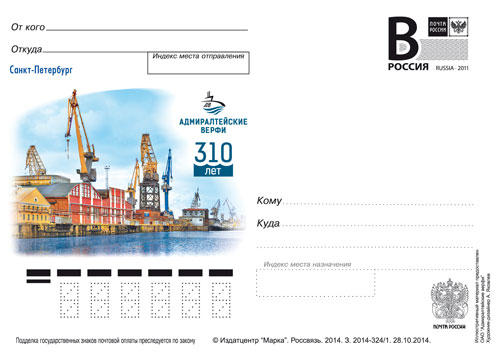 № 2014-324/1. Санкт-Петебург. Адмиралтейские верфи. 310 лет31.10.14, дизайнер – Яковлев А.
