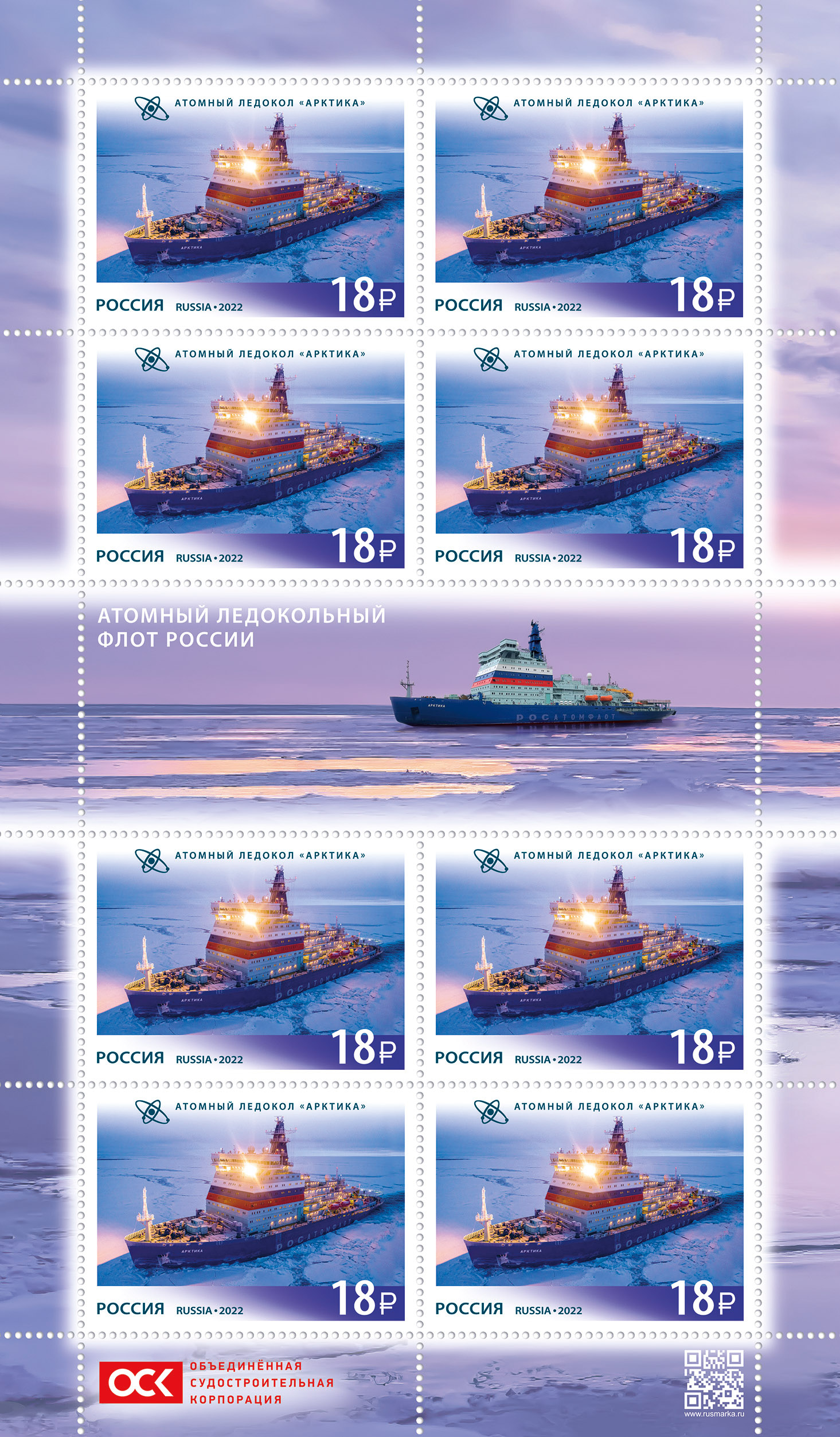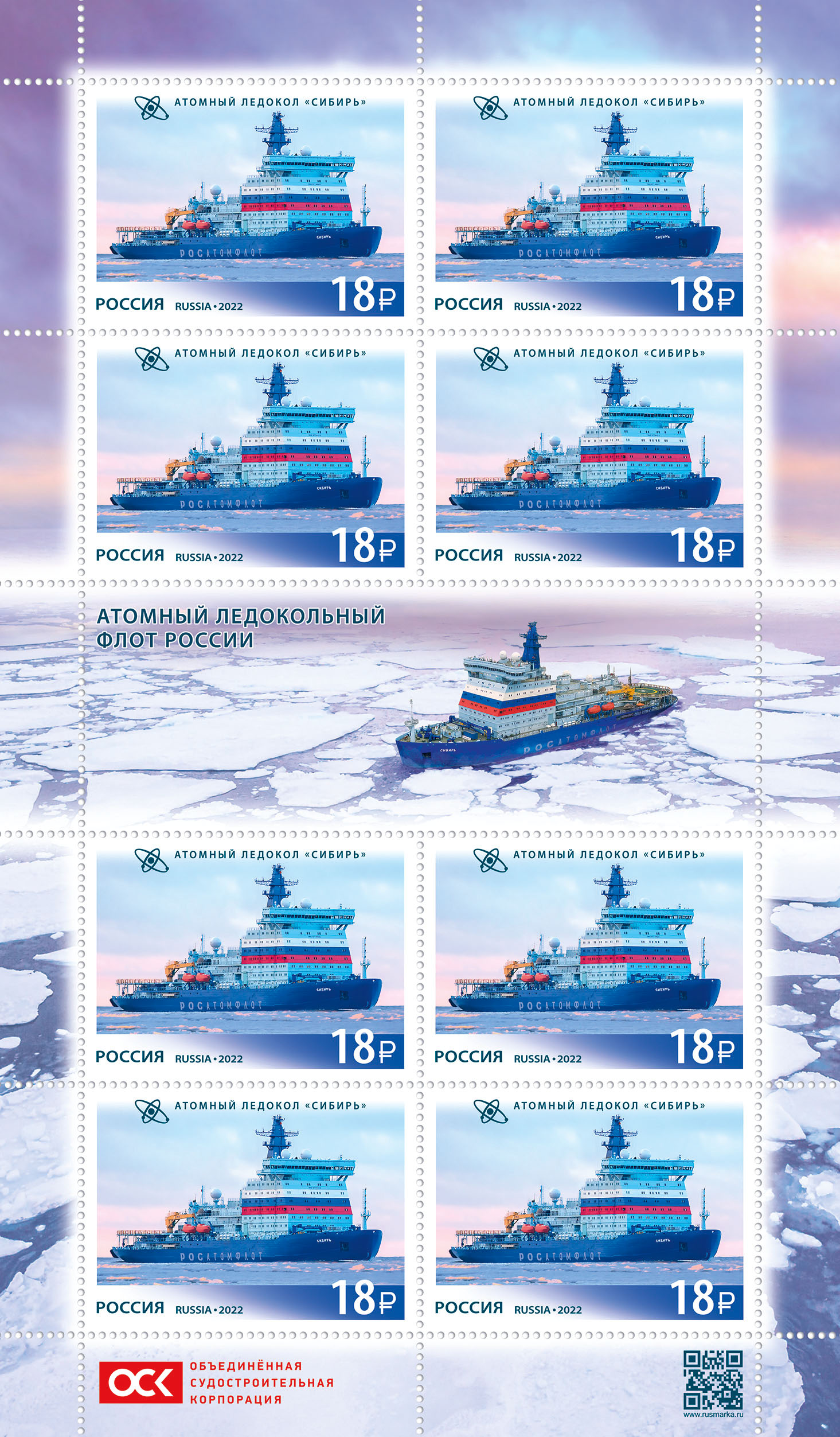На почтовых марках изображены атомные ледоколы «Арктика» и «Сибирь» на фоне ледовых пейзажей и символы атома.
