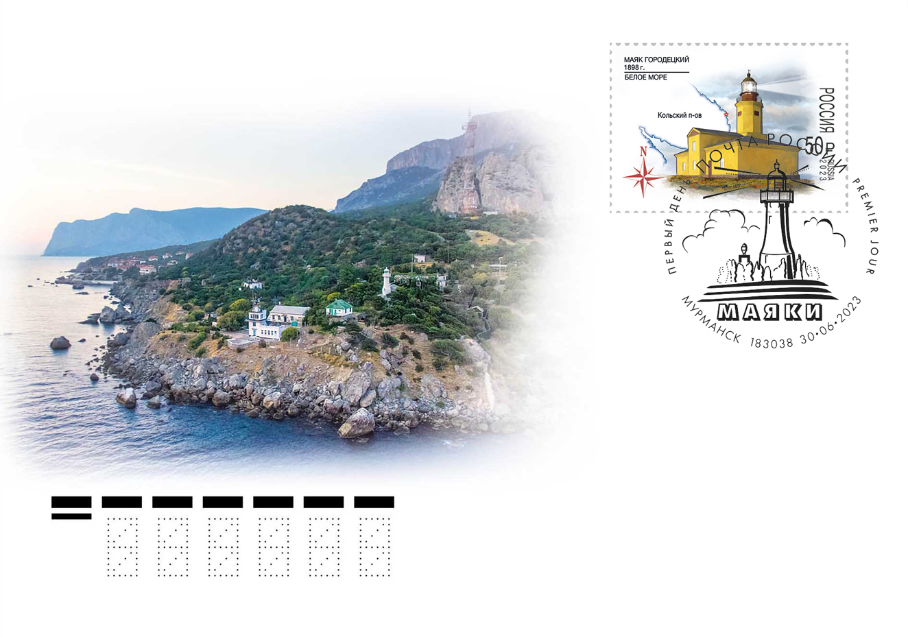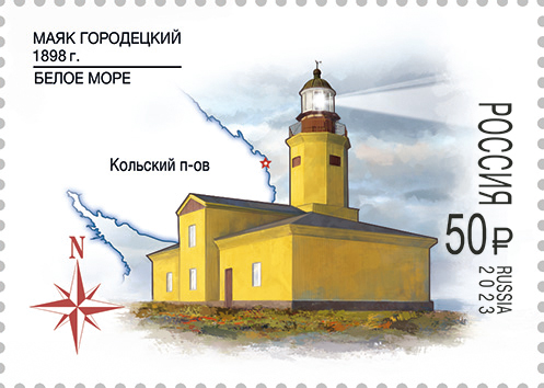 На почтовых марках изображены Кыз-Аульский маяк на фоне карты полуострова Крыма и розы ветров и Сетьнаволокский маяк на фоне карты Кольского полуострова и розы ветров.