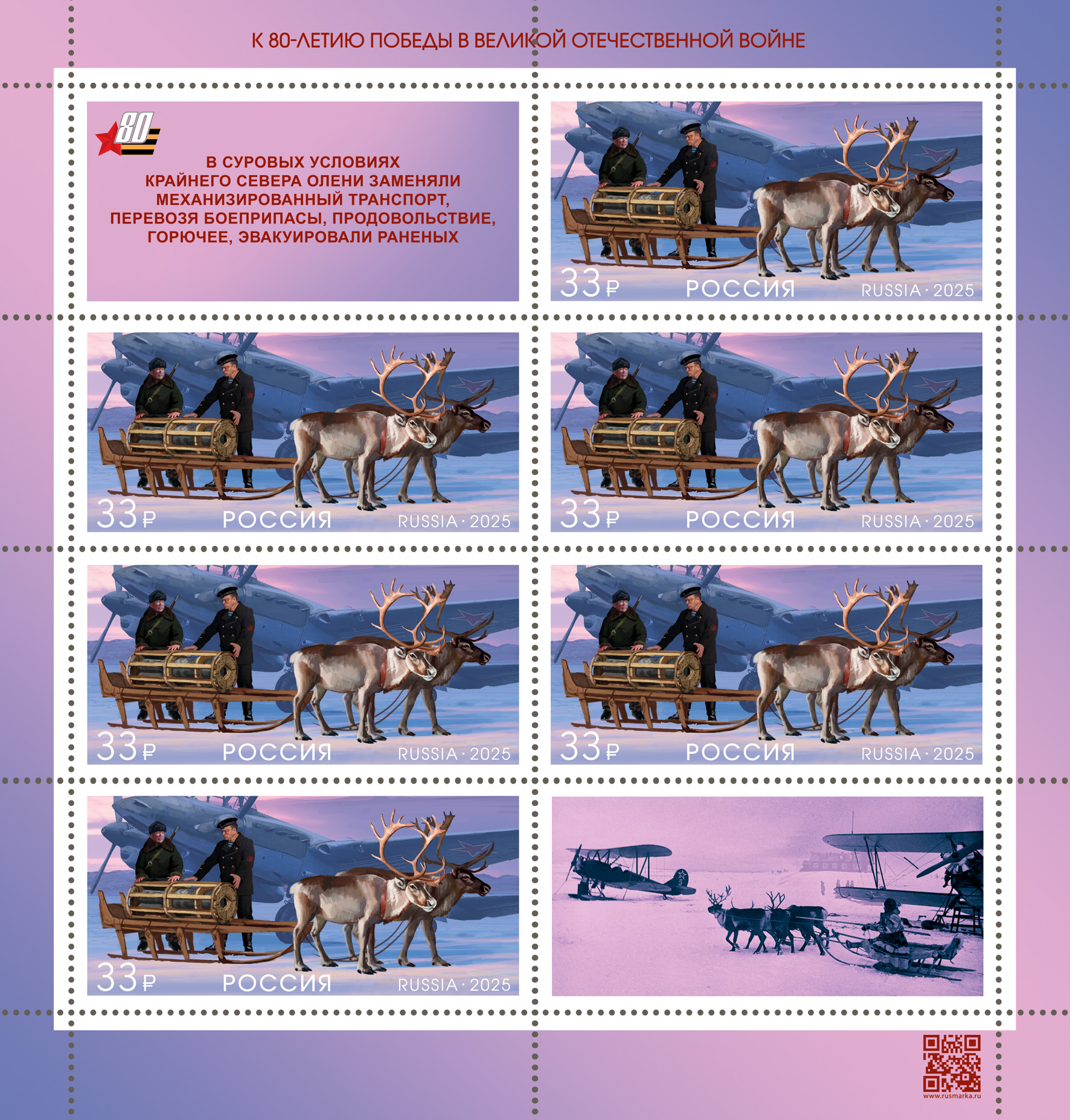 На почтовых марках изображены животные, участвовавшие в Великой Отечественной войне: собака-сапёр на железнодорожных путях на фоне разгромленного города; кошка с пойманной крысой на фоне Эрмитажа; пара верблюдов в упряжке, везущая солдат, на фоне Берлина 1945 года; северные олени, запряжённые санями с боеприпасами.