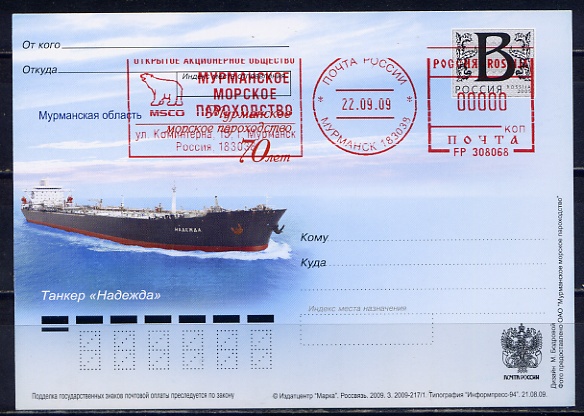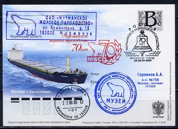 С 22 по 25 сентября в отделении почтовой связи г. Мурманска № 38, расположенном на проспекте Ленина,82а, будет проходить спецгашение письменной корреспонденции почтовым штемпелем «70 лет Мурманскому морскому пароходству. Мурманск 183038. 22-25.09.2009».