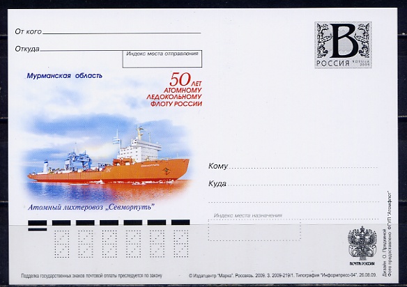 РОССИЯ 2009 КАРТОЧКИ С ЛИТЕРОЙ В "50 лет атомному флоту РОССИИ"