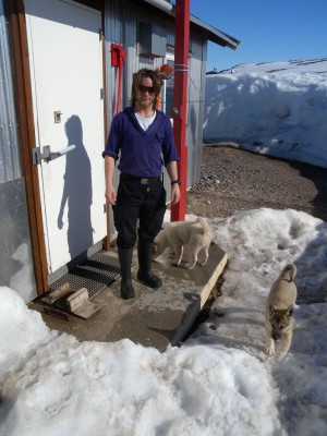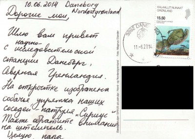 Рядом с исследовательской базой находится база датской погранзаставы (патруль на собачьих упряжках) "Сириус". Там же находится "почтовое отделение", откуда можно послать открытку с местным гашением, тем же штемпелем желающим ставится отметка в паспорте. На первом фото местный "Печкин" со своими "Шариками".![]()