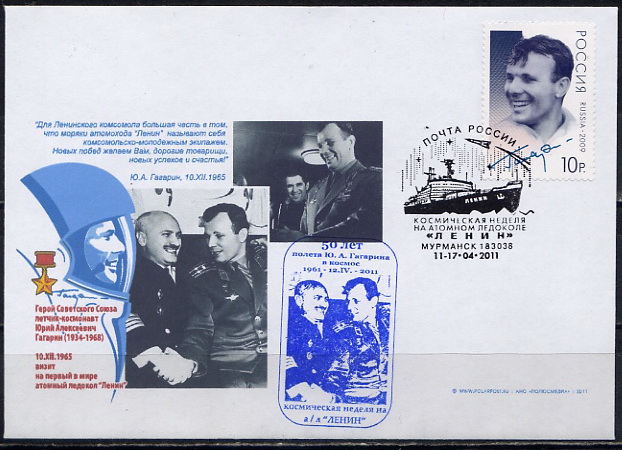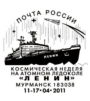С 11 по 17 апреля в отделении почтовой связи №38 г. Мурманска будет проходить гашение письменной корреспонденции специальным почтовым штемпелем «Космическая неделя на атомном ледоколе «Ленин». Мурманск 183038. 11-17.04.2011г.».