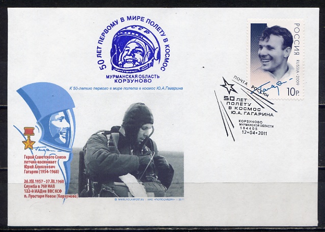 Конверты с СГ г. Мурманска (Космическая неделя на атомном ледоголе "ЛЕНИН") и Мурманской области (поселок Корзуново. место службы Ю.А.Гагарина на СФ) и поселок Сафоново (музей авиации СФ) подготовленные к 50-летию полета Ю.А.Гагарина
