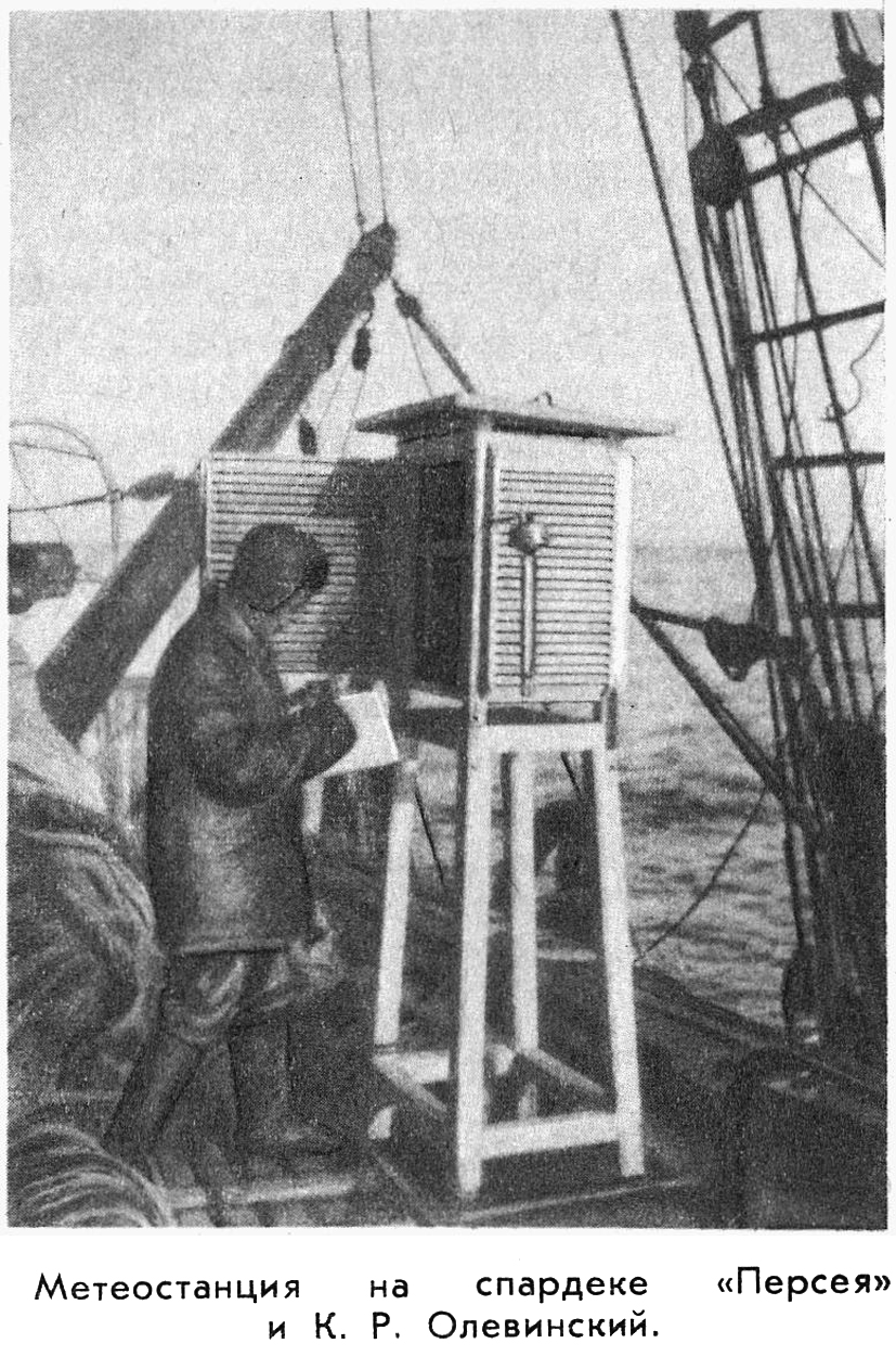 Я задержал внимание читателя на К. Р. Олевинском потому, что начиная с 1924 года он много лет работал на «Персее», показал себя отличным метеорологом и, несмотря на свои размеры, человеком «двужильным», т.е. обладал качествами, незаменимыми в морских экспедициях.