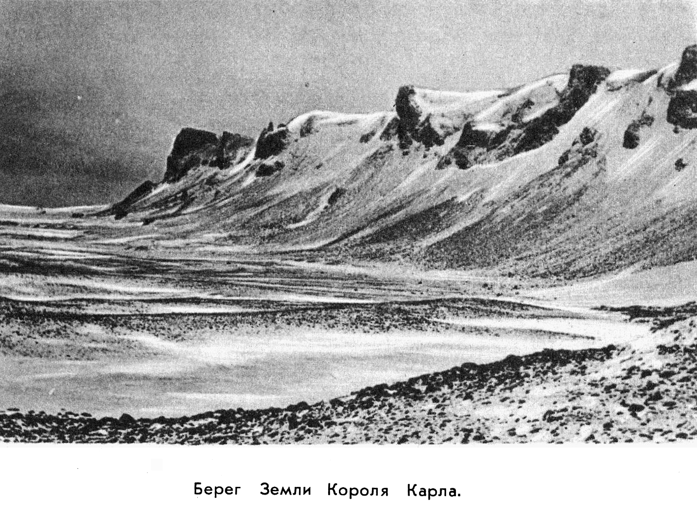 Гористый остров Свенскё, сложенный песчаниками, с выступающими почти черными базальтами, припорошенный снегом, выглядел очень неприветливо. Я бы сказал, что это слово слабо выражает впечатление, которое производила эта земля. Быть может, пасмурная погода и низкие клочья облаков усугубляли тяжелое впечатление. Мы высадились. Никто не знал, кто и когда побывал до нас на этом острове. На нем мы нашли маленькую, совсем развалившуюся промысловую избушку и невдалеке от нее сгнившую кулему на песца. Значит, люди здесь жили! Если принять во внимание размеры избушки, по всем признакам русской,
