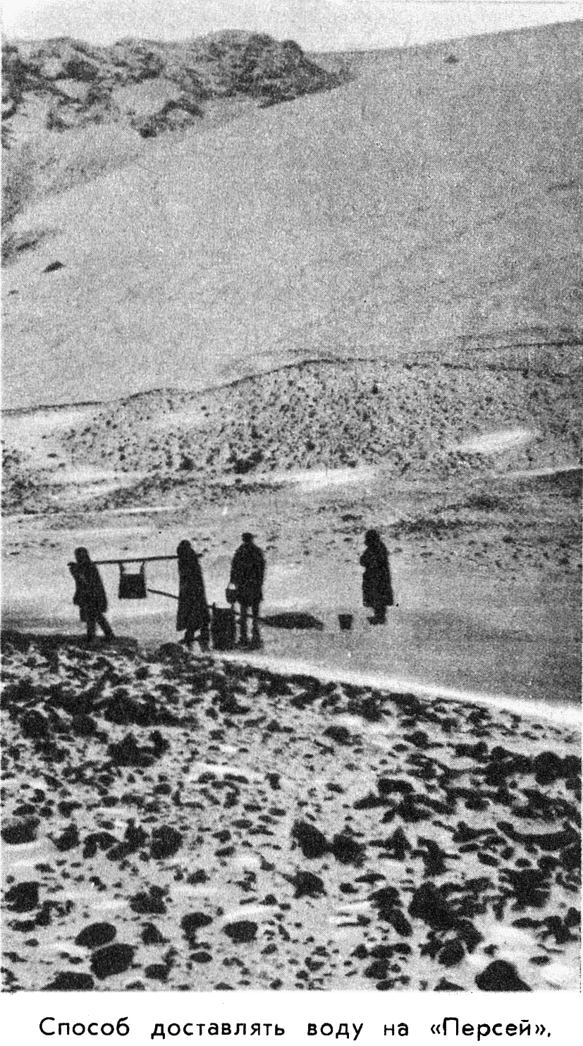 Потом заходили в море по колено, а по мере наполнения вельбота и глубже, и выливали в вельбот воду. И все это при пронзительном, шквалистом ветре и небольшой волне, которая вот-вот захлестнет в сапоги. Не легче было и доставить воду на судно. Надо было залезть в наполненный водой вельбот, отчего сидеть на банках приходилось на корточках, и еще грести до судна мили полторы. С судна спускали приемный шланг, и всю добытую с таким трудом воду «Персей» засасывал в какие-нибудь 4-5 минут. На то, чтобы налить и доставить к кораблю один вельбот с пресной водой, уходило от двух до трех часов. А так как из-за волны в бухте мы не заполняли шлюпку до краев, водозаборная деятельность длилась больше суток. Промокшие «наливальщики» на берегу работали на холодном ветру со снегом, лишь в перерывах греясь чаем у непрерывно горящего костра.