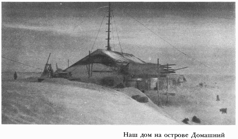 Дом наш состоял из трех частей: 20-метровой комнаты, 8-метровой кухни и 4-метровой комнаты для радиостанции. Прежде всего мы обили стены фанерой по войлоку, а потолок — вагонкой. На пол постелили линолеум. Вставили оконные рамы и заделали окна, собрали койки одну над другой (справа от входа, у наружной стены, Журавлеву и Ходову, слева — Ушакову и мне), обеденные и рабочие столы, табуретки. У окон, их было по два с каждой стороны дома, поставили рабочие столы — мой и Ушакова, а в простенке — обеденный стол. Над рабочими столами повесили полки для книг и бумаг. В кухне у плиты оборудовали широкий стол, в углу поместили большой бак на 20 ведер и умывальник. Все надо было делать с расчетом на долгое жительство. Затем я принялся за разборку грузов и монтаж ветряка, а Ходов — за радиостанцию.