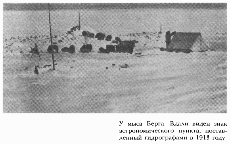 Бесчисленные каменистые уступы скал, образовавшиеся вследствие интенсивного морозного выветривания, дали приют тысячам птиц: люрикам, чистикам и разным видам чаек — все они уже прилетели на свои старые гнездовья, и их гомон приятно нарушал безмолвие полярной пустыни. В устье фиорда интенсивного таяния еще не заметно. Это нас успокоило, и мы по гладкому припаю быстро добрались до мыса Берга, где решили определить астрономический пункт.