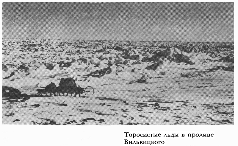 Отдохнув немного, тронулись дальше на восток. Береговая линия здесь была заснята гидрографической экспедицией довольно точно. Нам оставалось только прокорректировать и уточнить контуры береговой полосы, которая с судна, конечно, снималась гидрографами в общих чертах. Дорога тяжелая, торосистые льды местами прижаты к берегу вплотную. Нам пришлось выбираться на террасу высотой метров 50 с гружеными санями. Торошение проходило совсем недавно, так как лед в изломе совершенно свеж, а промежутки между льдинами еще не забиты снегом. Видно, что льды и зимой в проливе все время находятся в движении, скопляясь то у восточного, то у западного входа, в зависимости от господствующих ветров.