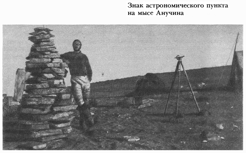 В тот же день мы прибыли на мыс Серпа и Молота и остановились в устье небольшой речки; это место приметное и удобное для определения астрономического пункта. Звезд теперь уже не было видно, и наблюдения приходилось вести по солнцу: в полдень — на юге, на закате — на западе, на восходе — на востоке. Пользуясь свободным временем, Журавлев отправился вдоль берега на восток по направлению маршрута, чтобы организовать еще один склад продовольствия. Возвращаясь обратно, он нашел на берегу пятиметровое бревно и захватил его с собой. Бревно поставили на месте астрономического пункта, обложили камнями, вырезали на нем свои инициалы, дату и название экспедиции. Ясная солнечная погода сменилась пасмурной, началась пурга, которая задержала нас здесь на два дня.