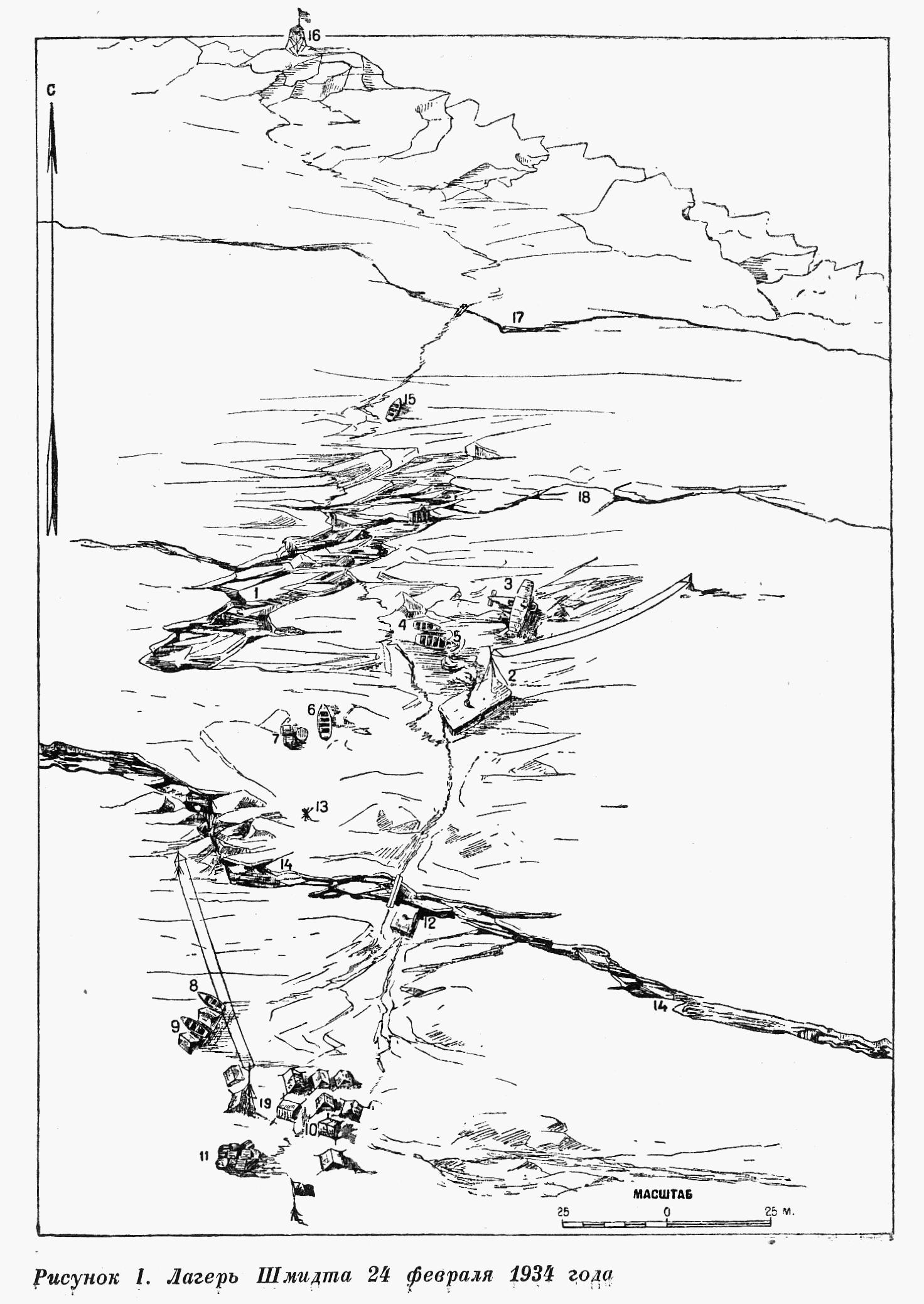 1 — место гибели "Челюскина"; 2 -барак; 3 -самолет Бабушкина «Ш-2»; 4 и 15 — шлюпки; 5-6- спасательные боты; 7 — склад жидкого топлива; 8-9 — шлюпки-ледянки; 10 — палатки; 11 — продовольственный склад; 12 — камбуз (кухня); 13- весла; 14, 17 и 18 — трещины 21 февраля; 16 — вышка; 19 — радиостанция (в бараке помещалась вторая — приемная — радиостанция; см. обозн. 2).