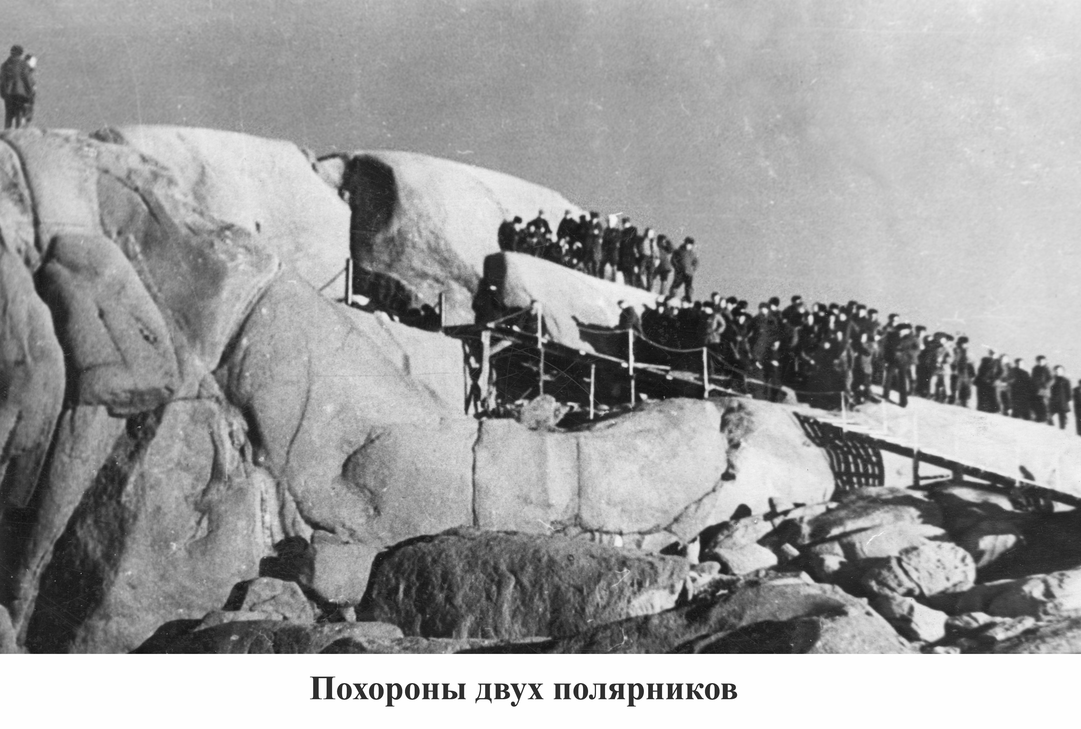 12 февраля 1957 года.Вертолетом доставили с ледника на Мирный два гроба с погибшими, после чего их на катере перевезли на остров, который назвали «Могильный». Там устроена могила на два гроба.