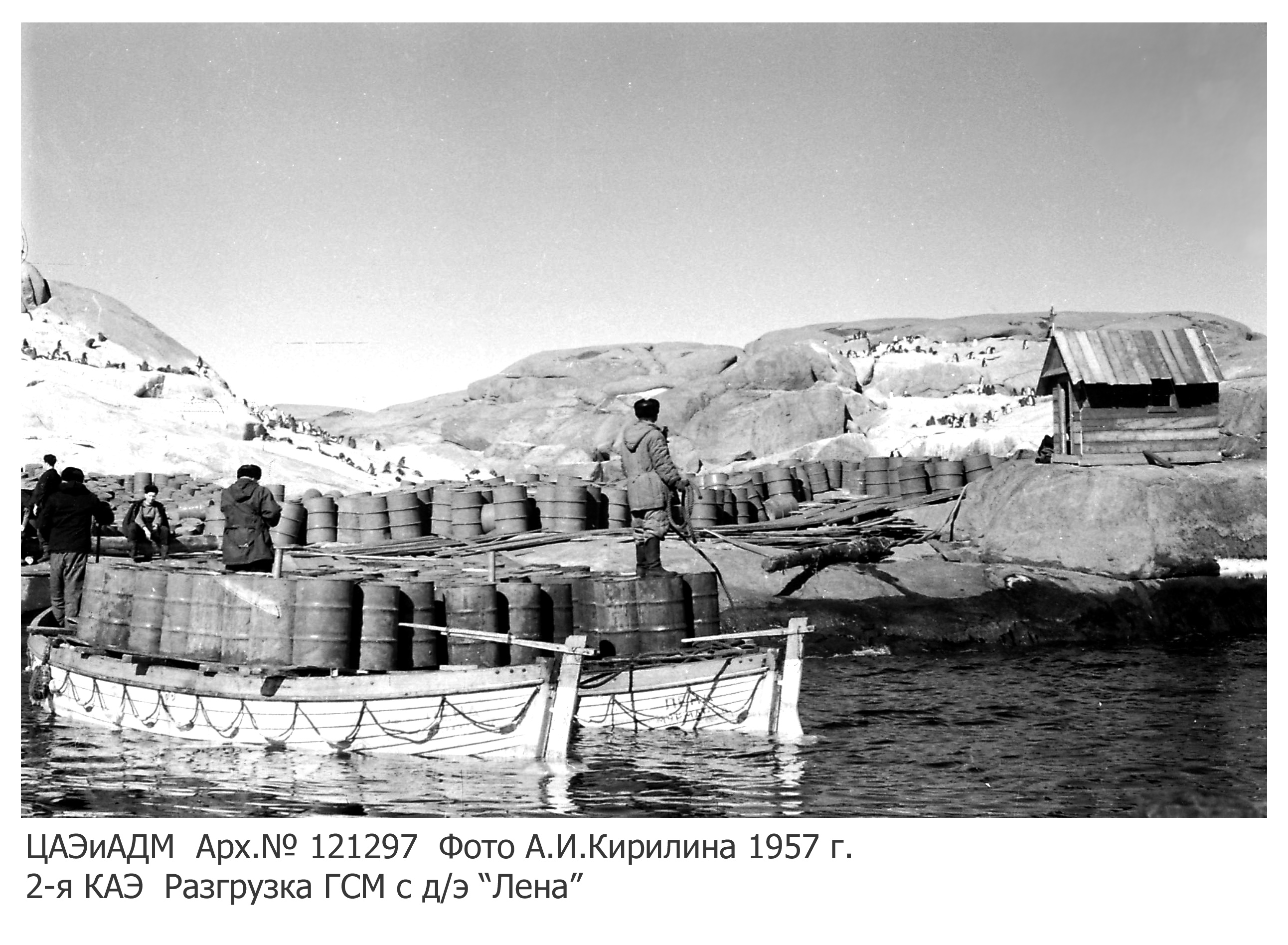 8 февраля 1957 года.Выгрузка трехсменная по 8 часов, в смене 20 человек. Нашей авиационной бригаде заступать в 16.00. Выгружаем авиабензин «Б-95». Бочки из трюма лебедкой поднимаем по 4 штуки и опускаем за борт на понтон, куда грузят по 150 бочек. Катер этот понтон тянет к острову, где с понтона бочки выкатывают по настилу.