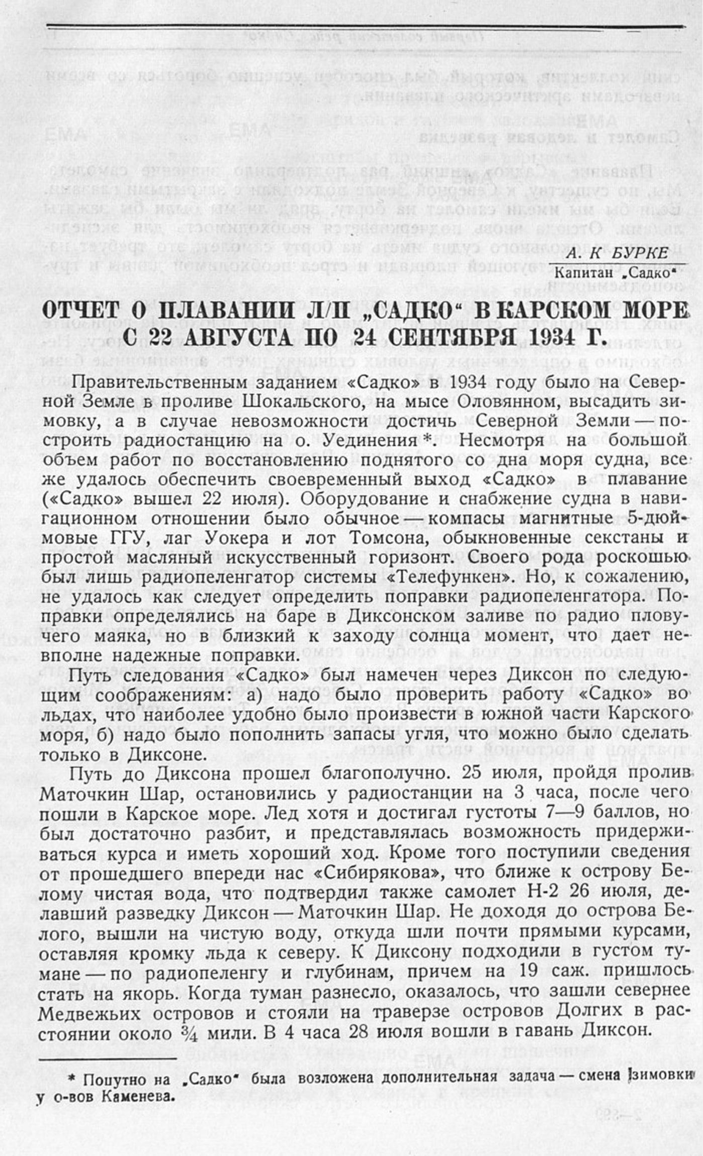 ОТЧЕТ О ПЛАВАНИИ Л/П „САДКО “ В КАРСКОМ МОРЕ С 22 АВГУСТА ПО 24 СЕНТЯБРЯ 1934 Г.Правительственным заданием «Садко» в 1934 году было на Северной Земле в проливе Шокальского, на мысе Оловянном, высадить зимовку, а в случае невозможности достичь Северной Земли — построить радиостанцию на о. Уединения *. Несмотря на большой объем работ по восстановлению поднятого со дна моря судна, все же удалось обеспечить своевременный выход «Садко» в плавание («Садко» вышел 22 июля). Оборудование и снабжение судна в навигационном отношении было обычное — компасы магнитные 5-дюймовые ГГУ, лаг Уокера и лот Томсона, обыкновенные секстаны и простой масляный искусственный горизонт. Своего рода роскошью был лишь радиопеленгатор системы «Телефункен». Но, к сожалению, не удалось как следует определить поправки радиопеленгатора. Поправки определялись на баре в Диксонском заливе по радио пловучего маяка, но в близкий к заходу солнца момент, что дает не вполне надежные поправки.