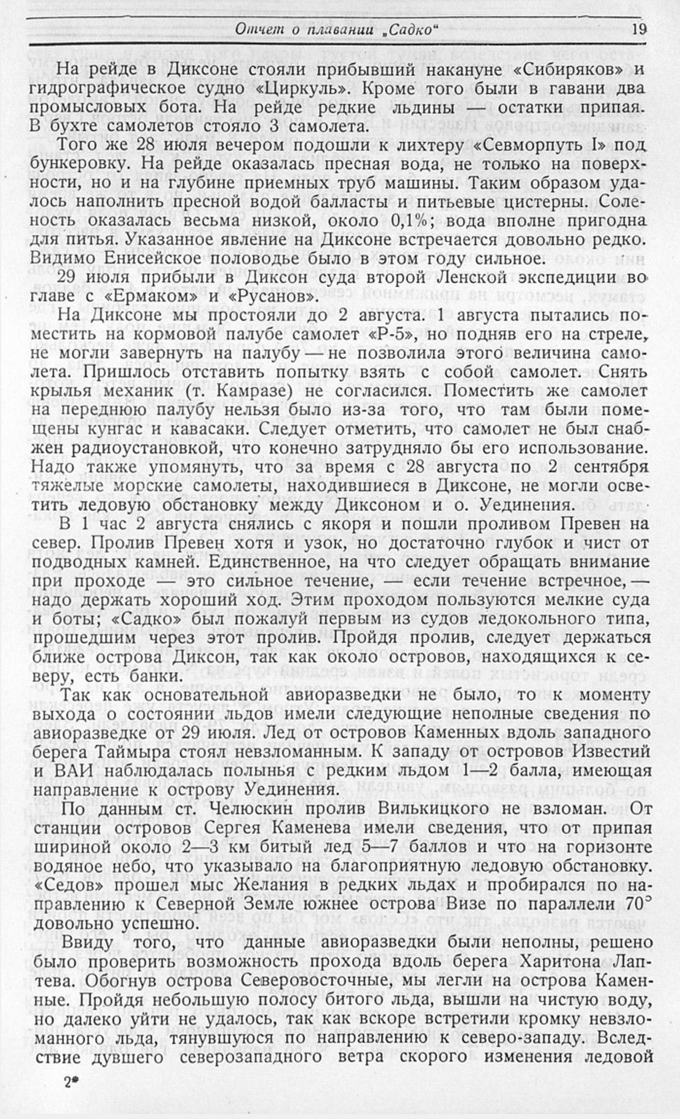 На Диксоне мы простояли до 2 августа. 1 августа пытались поместить на кормовой палубе самолет «Р-5», но подняв его на стреле, не могли завернуть на палубу — не позволила этого величина самолета. Пришлось отставить попытку взять с собой самолет. Снять крылья механик (т. Камразе) не согласился. Поместить же самолет на переднюю палубу нельзя было из-за того, что там были помещены кунгас и кавасаки. Следует отметить, что самолет не был снабжен радиоустановкой, что конечно затрудняло бы его использование. Надо также упомянуть, что за время с 28 августа по 2 сентября тяжелые морские самолеты, находившиеся в Диксоне, не могли осветить ледовую обстановку между Диксоном и о. Уединения.