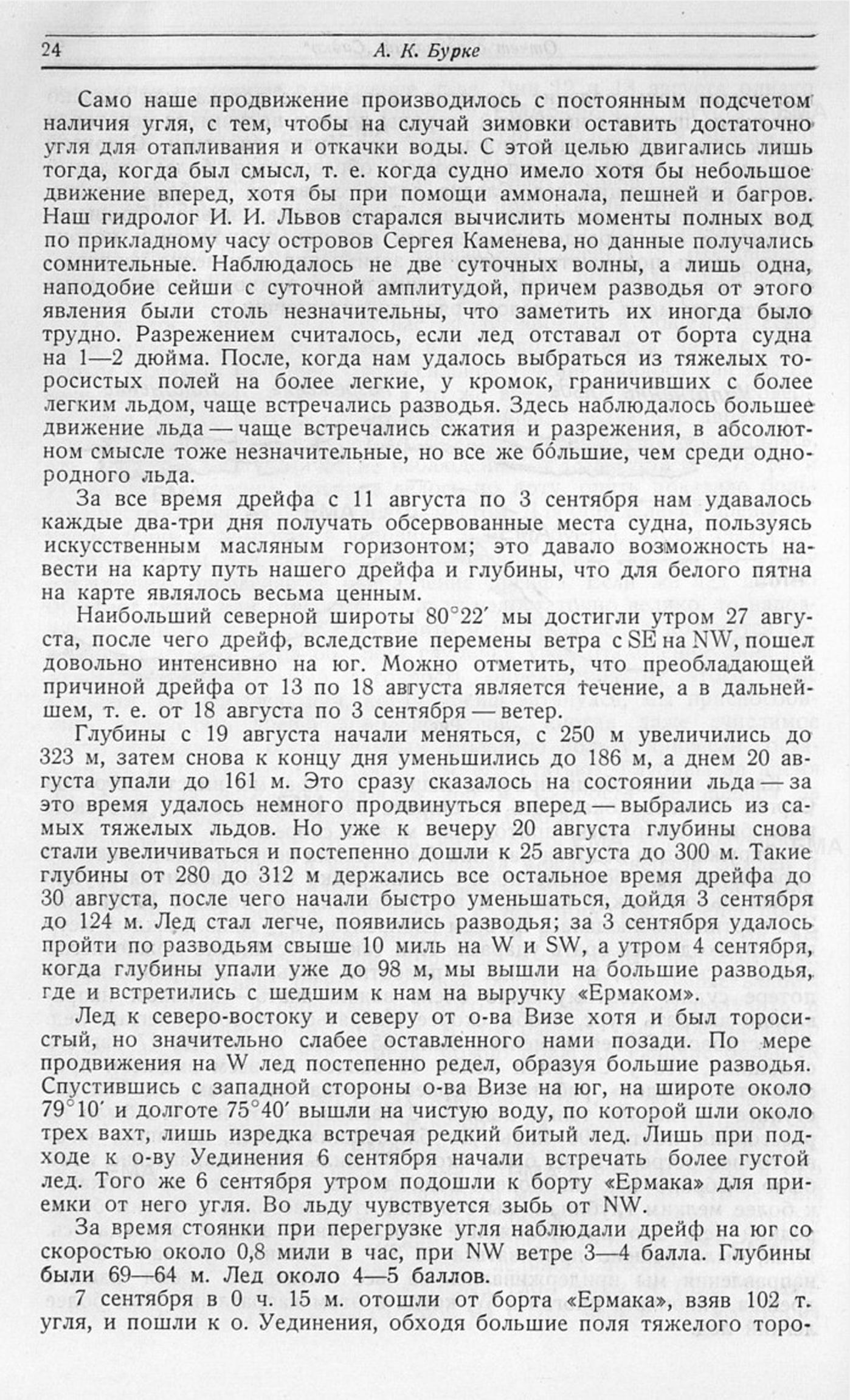 следствием некоторое разрежение льда. Дни 12 и 13 августа однако перемен в состоянии льда не принесли. Обсервация 13 августа показала снос на WSW около 12 миль. Ветер продолжался вплоть до 16 августа остовых румбов — преимущественно NE— ENE силы 5—6 баллов, с дождем. Однако лед не только не разводило, но после 13 августа заметно уплотнило. Дрейф продолжали определять NW и WSW вначале, а позже на NW и NNE и N, но ввиду значительных глубин (свыше 200 м) точность направления дрейфа по отклонению линя лота получалась малонадежной, что и показала обсервация 16 августа, когда получили место φ =79°42' и l = 88°71'.