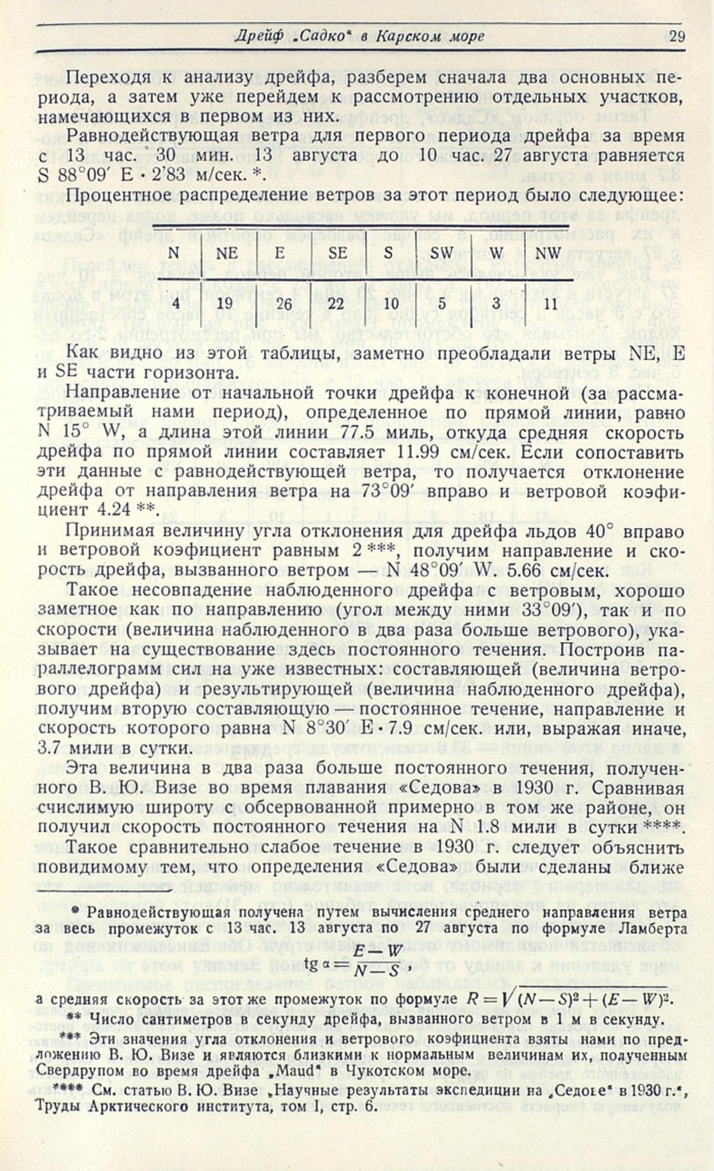 *** Эти значения угла отклонения и ветрового коэффициента взяты нами по предложению В. Ю. Визе и являются близкими к нормальным величинам их, полученным Свердрупом во время дрейфа "Maud" в Чукотском море.