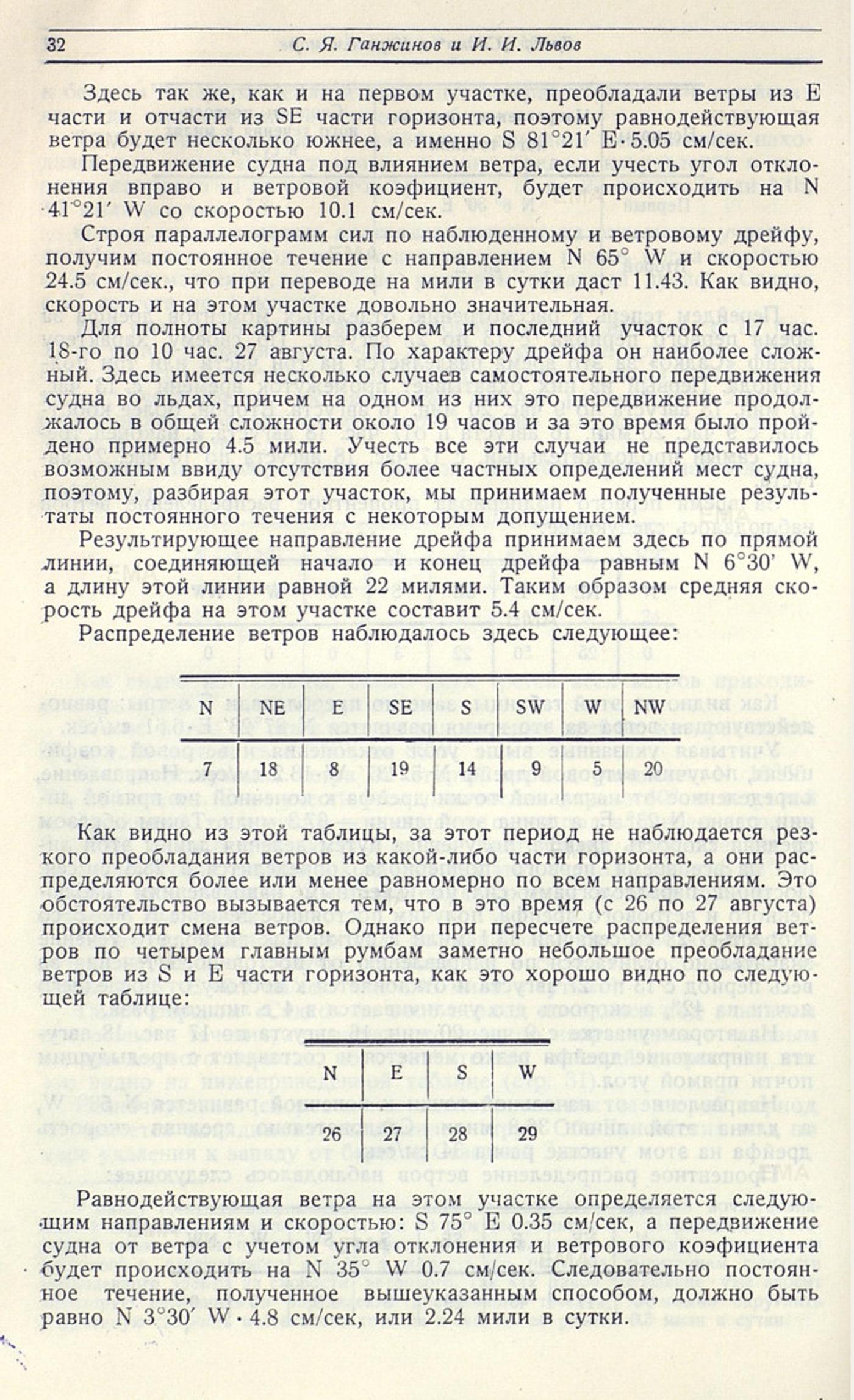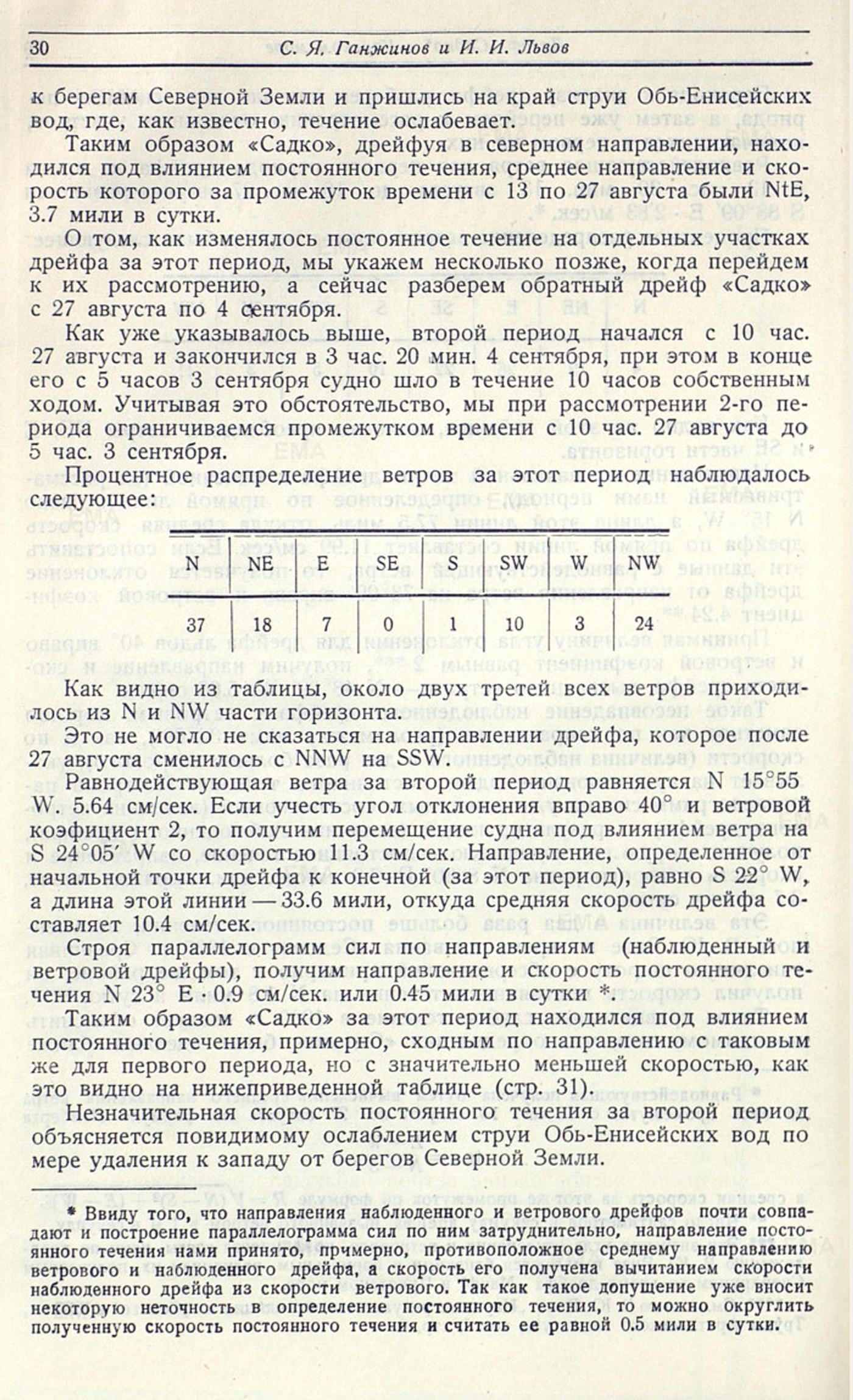 Такое довольно резкое разделение этих периодов по направлению в самой северной точке дрейфа отчасти согласуется с распределением ветров, которые до 26 августа имели преобладающее направление из SE и NE части горизонта, а впоследствии перешли в NW четверть. Некоторое несовпадение моментов (смены ветра и перемены направления дрейфа) объясняется, вероятно, существованием переломного периода с 26 августа до 20 час. 27 августа, в течение которого судно вместе со льдом продолжало дрейфовать по инерции в прежнем направлении.