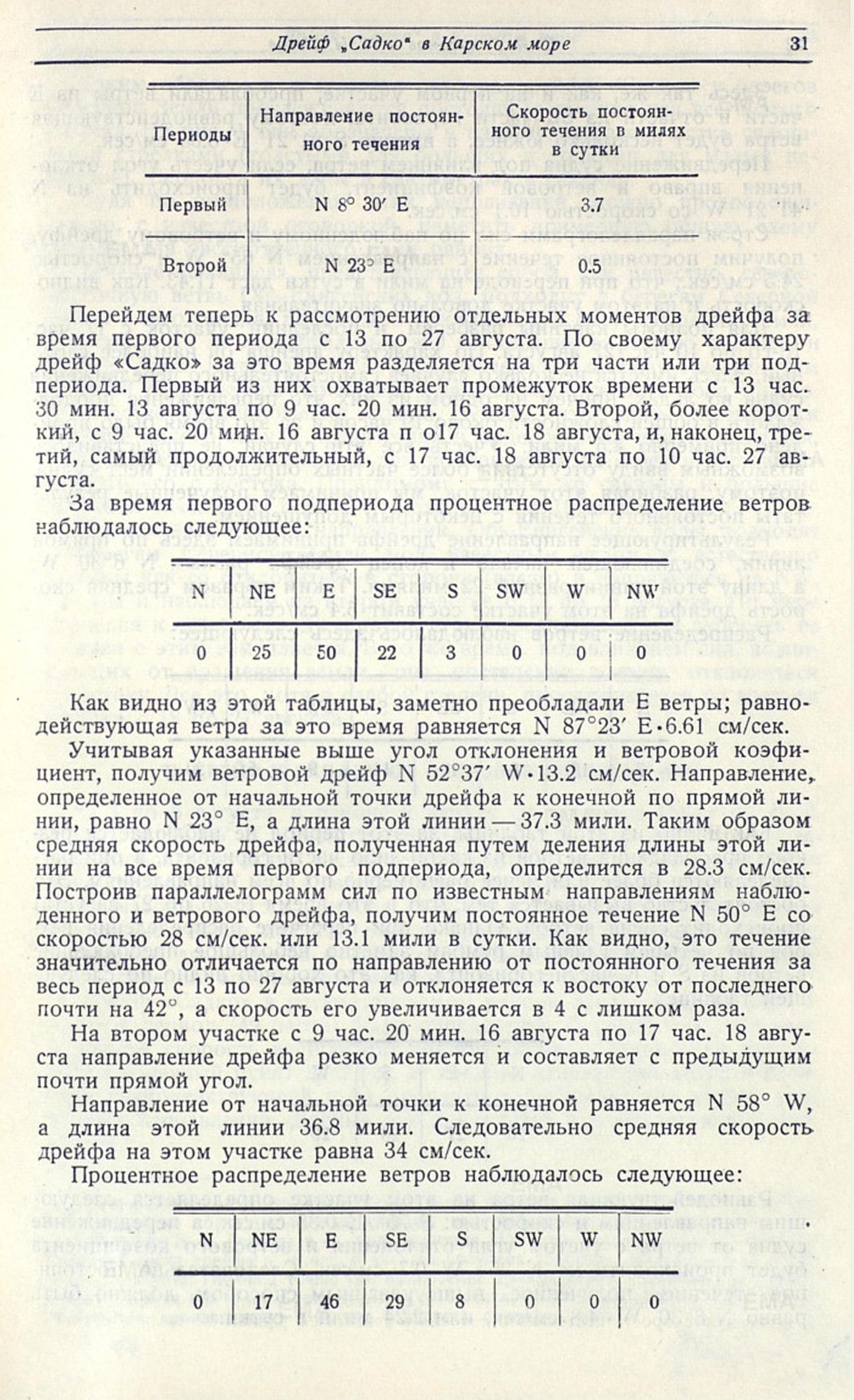 Таким образом «Садко» за этот период находился под влиянием постоянного течения, примерно, сходным по направлению с таковым же для первого периода, но с значительно меньшей скоростью, как это видно на нижеприведенной таблице (стр. 31).