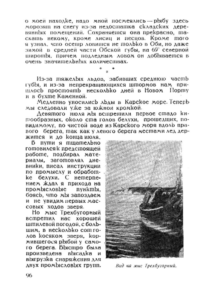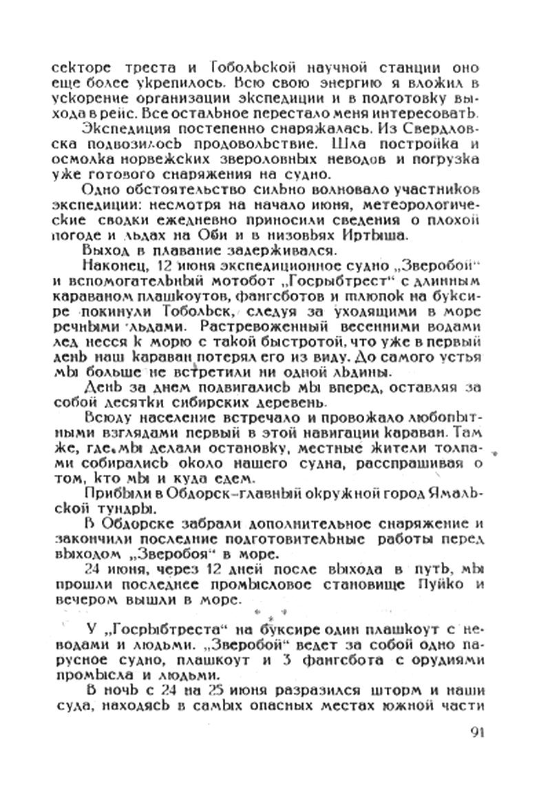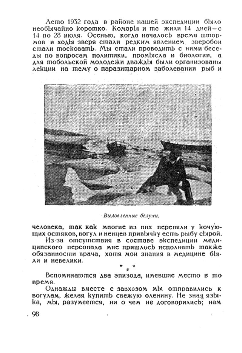 Известие о том, что я назначен в состав Обской зверобойной экспедиции 1932 года для научных работ по белухе, меня чрезвычайно обрадовало. Я был в это время студентом последнего курса Мосрыбвтуза и находился в отпуску, которым с удовольствием пожертвовал ради поездки, представлявшей собой огромный интерес, главным образом потому, что она давала мне возможность провести самостоятельную научную работу и тем самым проверить подготовку. полученную мною в вузе.