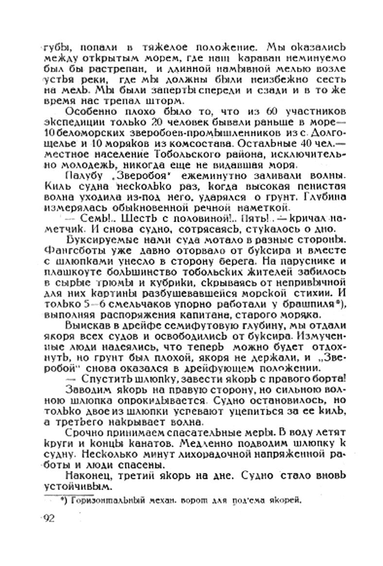 Буксируемые нами суда мотало в разные стороны. Фангсботы уже давно оторвало от буксира и вместе с шлюпками унесло в сторону берега. На паруснике и плашкоуте большинство тобольских жителей забилось в сырые трюмы и кубрики, скрываясь от непривычной для них картины разбушевавшейся морской стихии. И только 5 - 6 смельчаков упорно работали у брашпиля *), выполняя распоряжения капитана, старого моряка.
