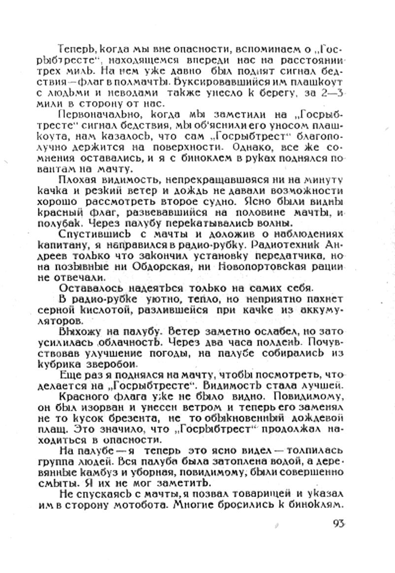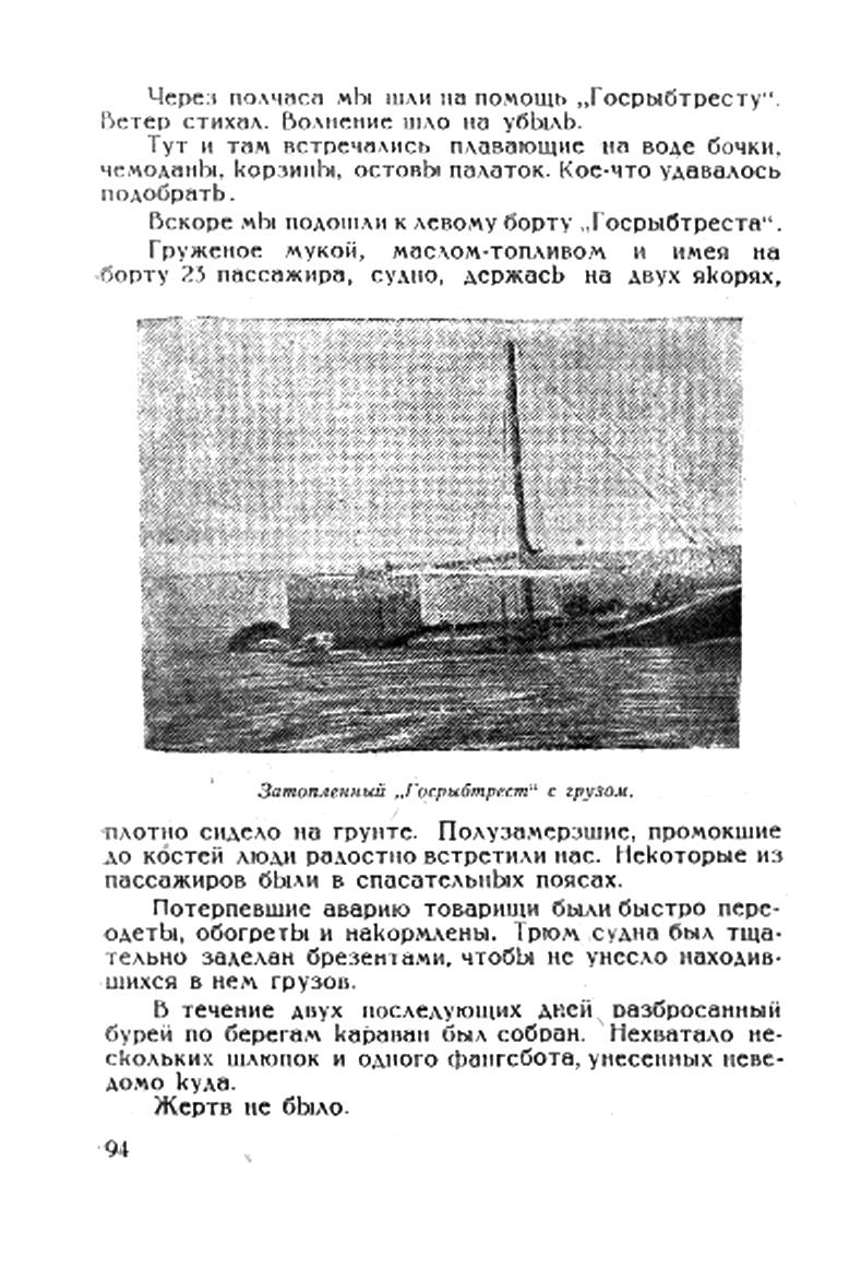 Теперь, когда мы вне опасности, вспоминаем о "Госрыбтресте", находящемся впереди нас на расстоянии трех миль. На нем уже давно был поднят сигнал бедствия - флаг в полмачты. Буксировавшийся им плашкоут с людьми и неводами также унесло к берегу, за 2—3 мили в сторону от нас.