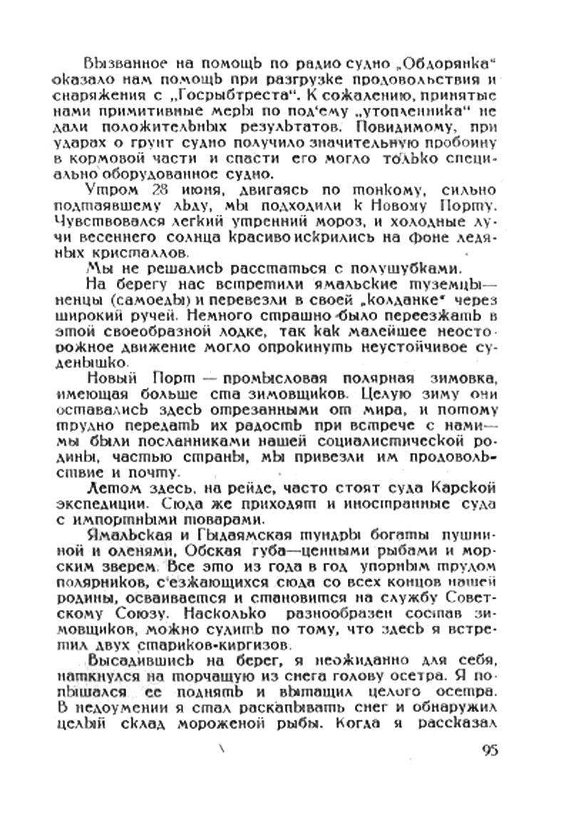 Ямальская и Гыдаямская тундры богаты пушниной и оленями. Обская губа — ценными рыбами и морским зверем. Все это из года в год упорным трудом полярников, съезжающихся сюда со всех концов нашей родины, осваивается и становится на службу Советскому Союзу. Насколько разнообразен состав зимовщиков. можно судить по тому, что здесь я встретил двух стариков-киргизов.