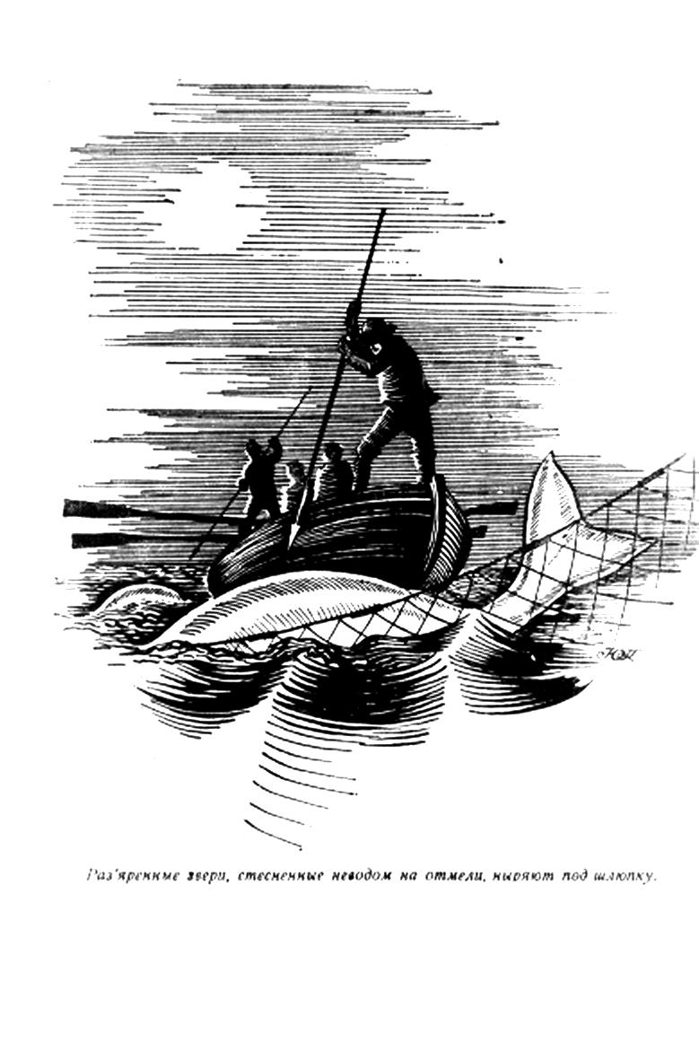 Разъярённые звери, стеснённые неводом на отмели. мечутся, бросаются к задней стенке невода, где глубже, ныряют под шлюпку, с силой ударяя хвостами о поверхность воды и борта шлюпок. И нужно много выдержки и сноровки, чтобы своевременно и точно нанесши удар и в то же время соблюсти равновесие в шлюпке. Удар впустую может повлечь вывих руки. Промахнувшись, охотник может перелететь через борт и попасть в невод к белухам, которые и сомнут его.