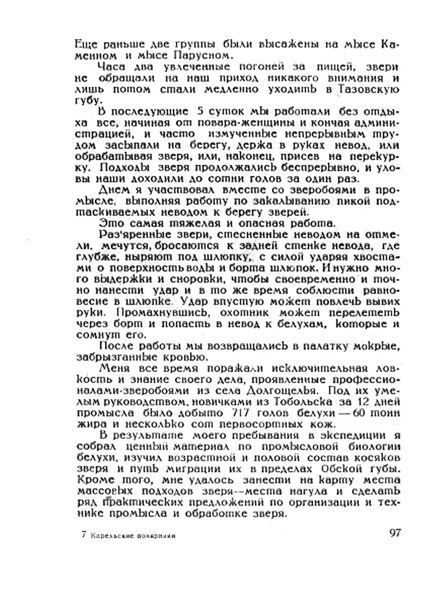 В результате моего пребывания в экспедиции я собрал ценный материал по промысловой биологии белухи, изучил возрастной и половой состав косяков зверя и путь миграции их в пределах Обской губы. Кроме того, мне удалось занести на карту места массовых подходов звери - места нагула и сделать ряд фактических предложений по организации и технике промысла и обработке зверя.