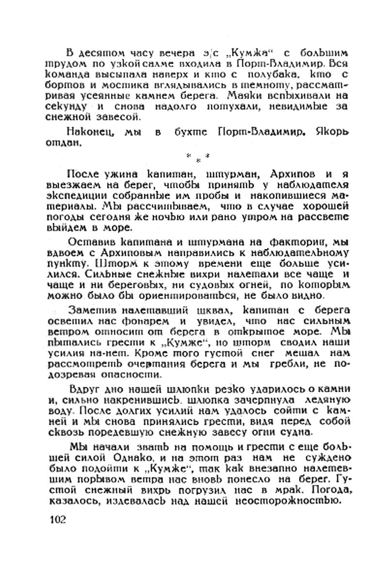 Здесь мне хочется принести искреннюю благодарность всем тем товарищам, которые принимали участие в мое. м спасении. С благодарностью я вспоминаю о карельских беломорских моряках, составлявших команды "Кумжи" и "Николая Книповича", на котором в январе 1935 года я совершил свой последний рейс в поисках сельди.