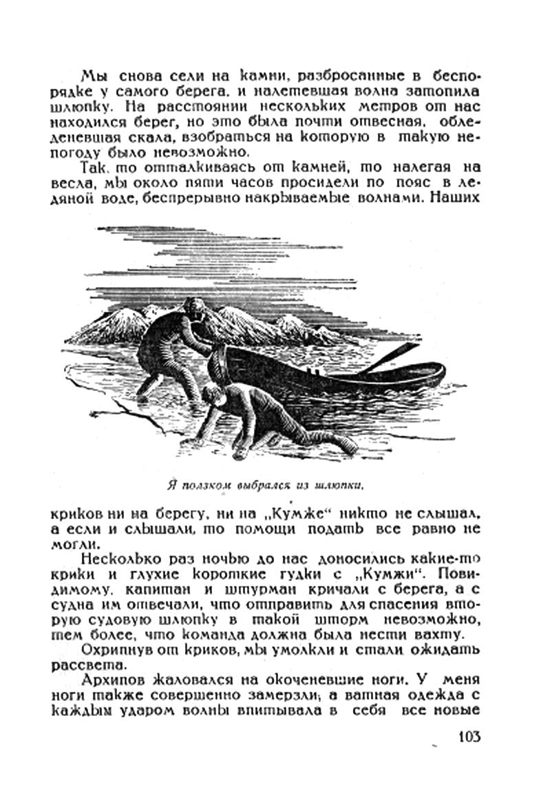 Что касается меня, то я уже не мог разогнуть ног и ползком выбрался из шлюпки. На берегу я несколько раз пытался встать на ноги и каждый раз, как подкошенный, подал на снег.