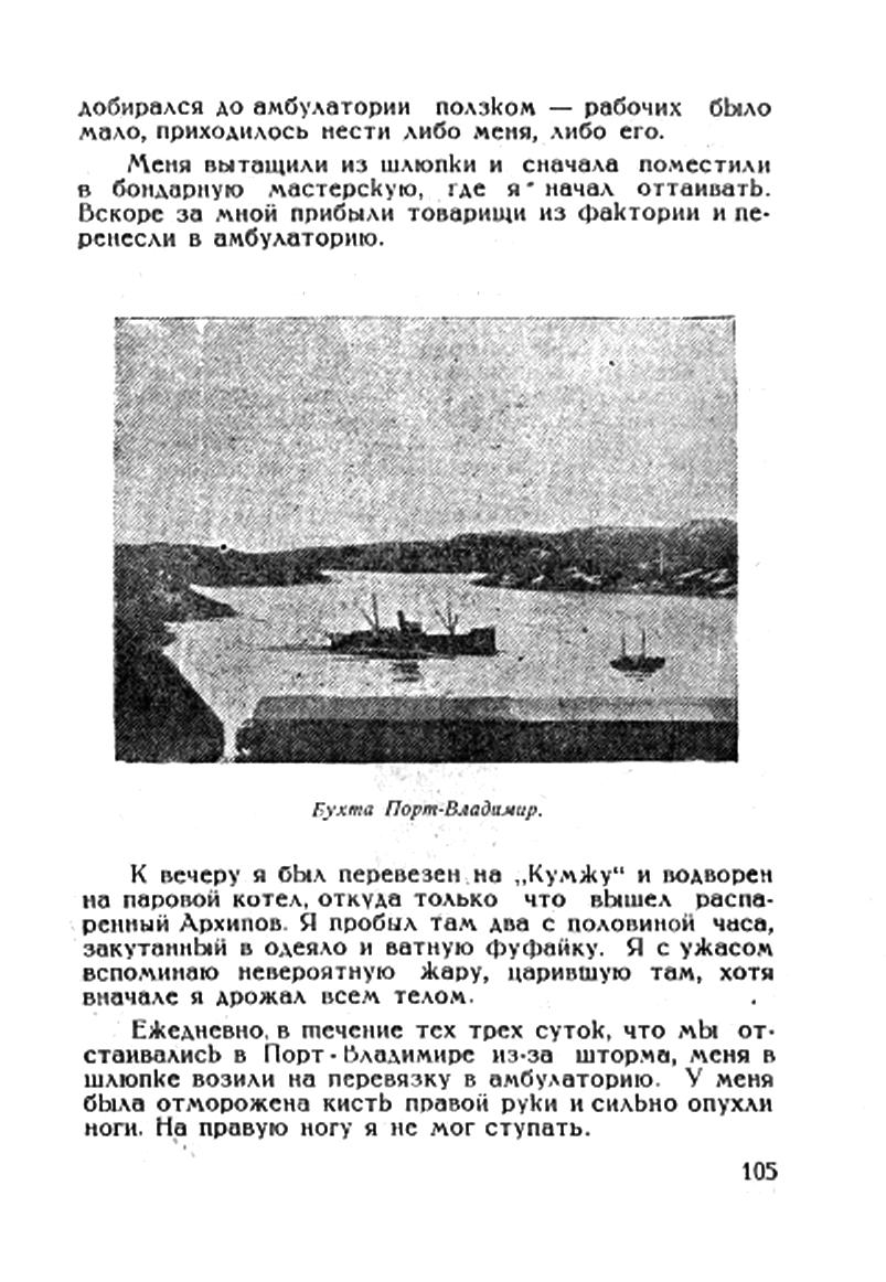 Ежедневно, в течение тех трех суток, что мы отстаивались в Порт-Владимире из-за шторма, меня в шлюпке возили на перевязку в амбулаторию. У меня была отморожена кисть правой руки и сильно опухли ноги. Но правую ногу я не мог ступать.