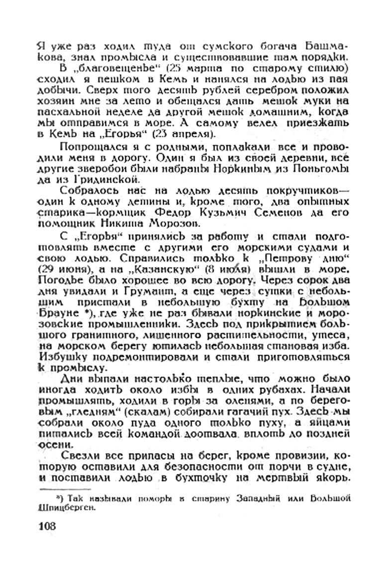 Метались мы от хозяина к хозяину, где бы только получить работу да кусок хлеба для семейства. Вдруг слышно стало, уже под весну, что кемский купец Норкин набирает большую команду на зверобой-ный промысел к Груманту. Посоветовался я с батюшкой **) и решил наняться к Норкину в промысел.