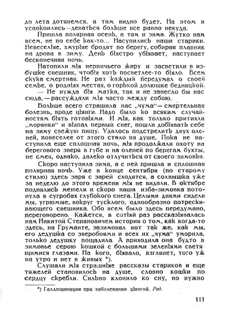 Скоро наступила зима, а с ней пришла и сплошная полярная ночь. Уже в конце сентября (по старому стилю) здесь заря с зарей сходятся, а солнышка уже за неделю до этого времени мы не видали. В октябре поднялись метели и скоро паша изба-зимовка потонула в сугробах глубокого снега. Целыми днями сидели мы, угрюмые, вокруг тусклого, однообразно потрескивающего свешника. Обо всем было здесь передумано, переговорено. Кажется, в сотый раз рассказывалась нам Никитой Степановичем история о том, как когда-то здесь, на Груманте, зазимовал вот так же, как мы, его дедушка со зверобоями и всех их "чума" уморила, только дедушку пощадила. А приходила она будто в зимовье серою кошкой с большими зелёными светящимися глазами. На кого, бывало, взглянет, того уж на утро и нет в живых *).